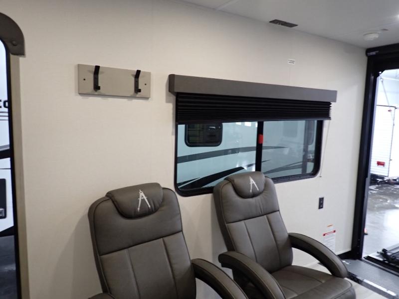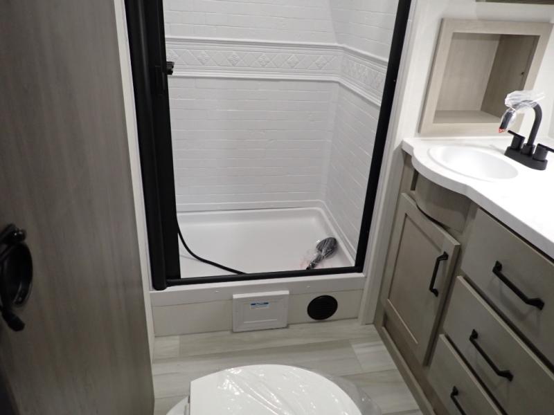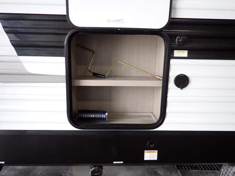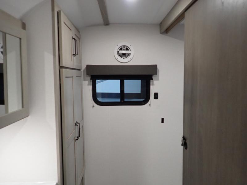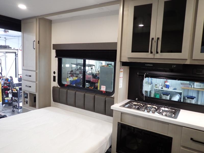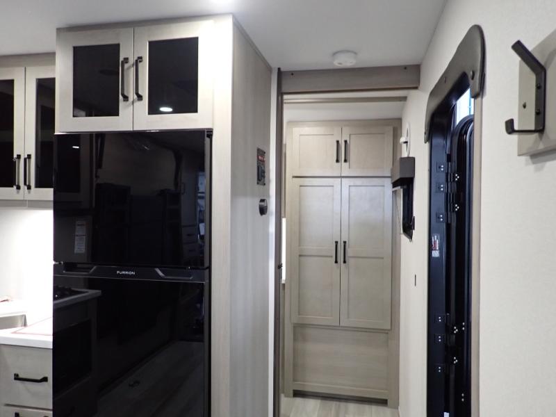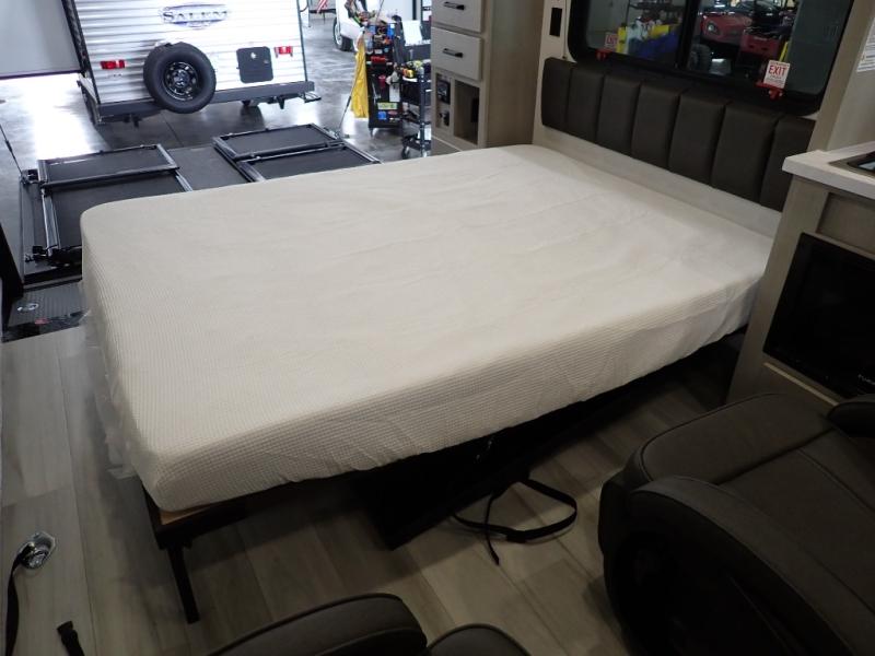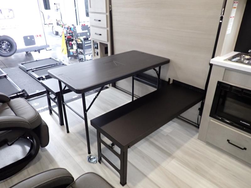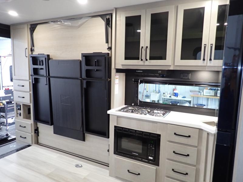 Get ready to take your adventures to the next level with this amazing toy Hauler. A spacious interior features a queen-sized murphy bed, perfect for relaxing after a long day of exploring. A convenient microwave and three-burner cooktop offer endless culinary possibilities, while a 12V 8cu. refrigerator keeps your essentials at the perfect temperature. Ample overhead cabinets provide additional storage for gear, cookware, and more. At the front of this toy hauler, a full bathroom with a closet provides a private retreat, and the ramp door/patio offers easy access to your toys and outdoor living space. Plus, a 13' awning offers shade and protection from the elements.