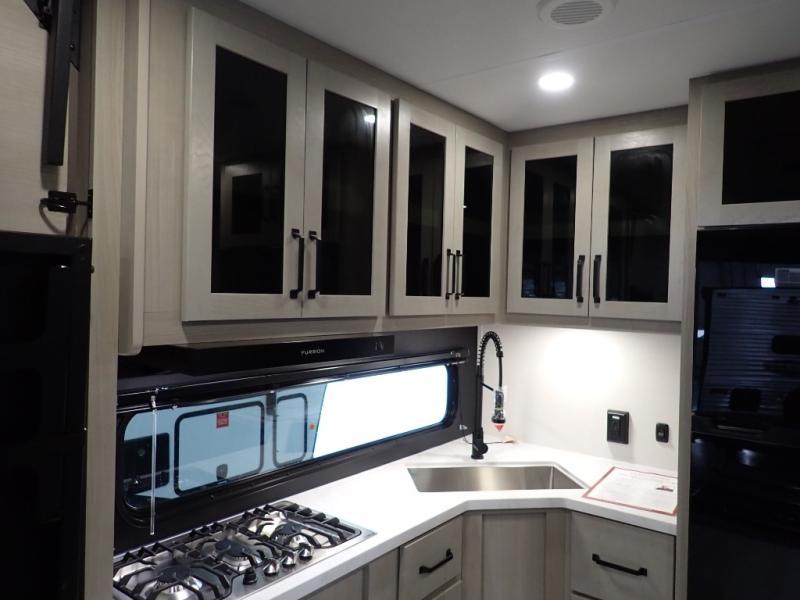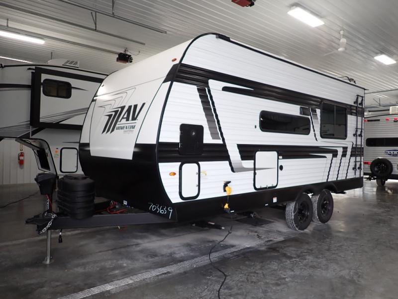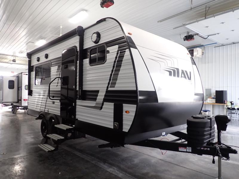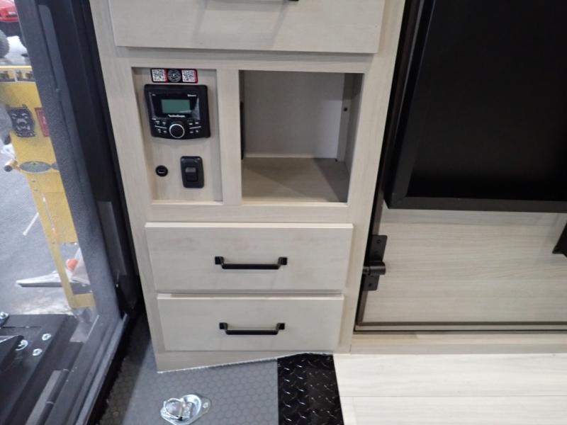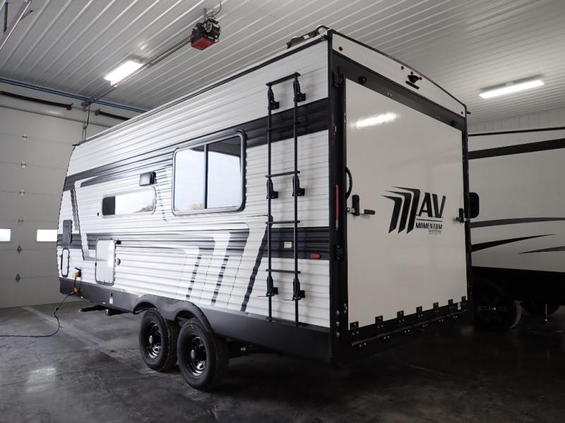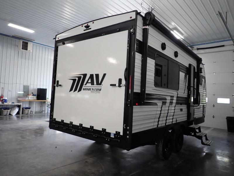 The Momentum MAV toy hauler travel trailers by Grand Design are designed to provide exactly what you need. The spacious garage provides tons of cargo space, with no wheel wells to get in the way. Additional storage includes magnetic storage door catches, and overhead consoles throughout. Conveniences like motion sensor lights and USB outlets will make your life easier, and you will be comfortable in all seasons with the 30K BTU furnace plus 15K BTU ducted air conditioning. The standard Solar Package comes with a 180W solar panel, a 40 Amp charge controller with Bluetooth, and a 12V refrigerator so you can go off-grid when the adventure calls for it.