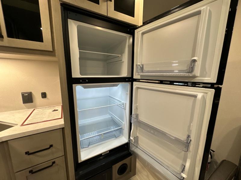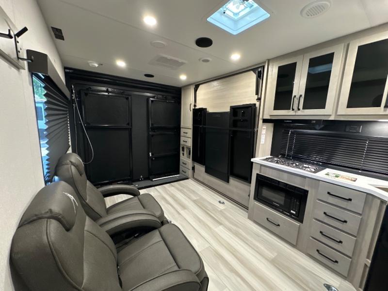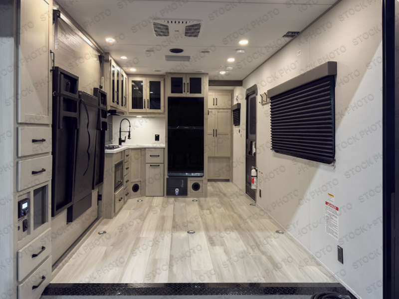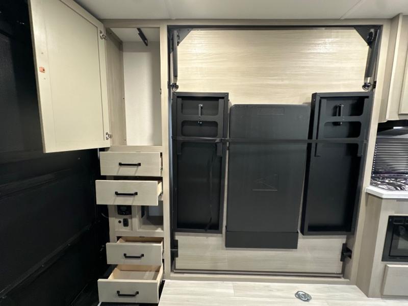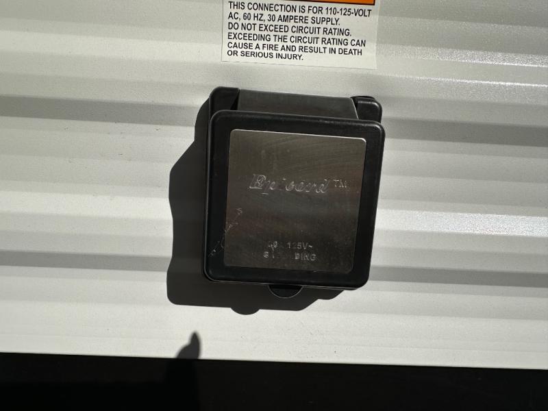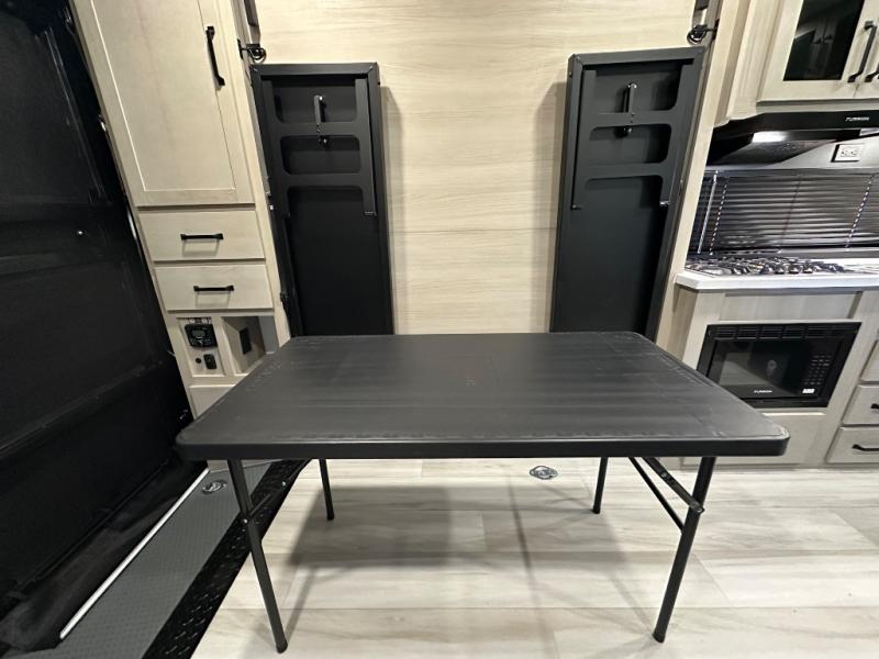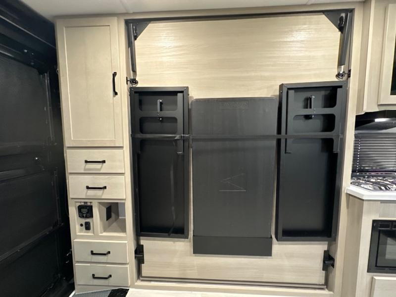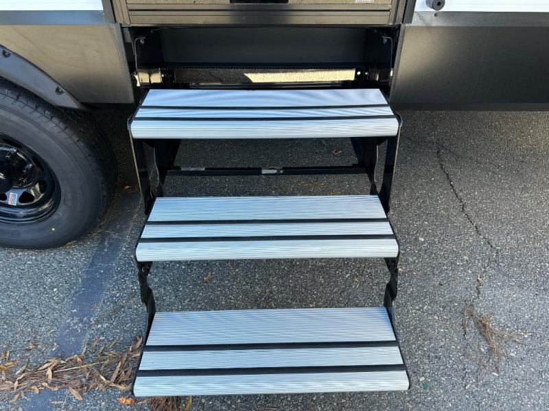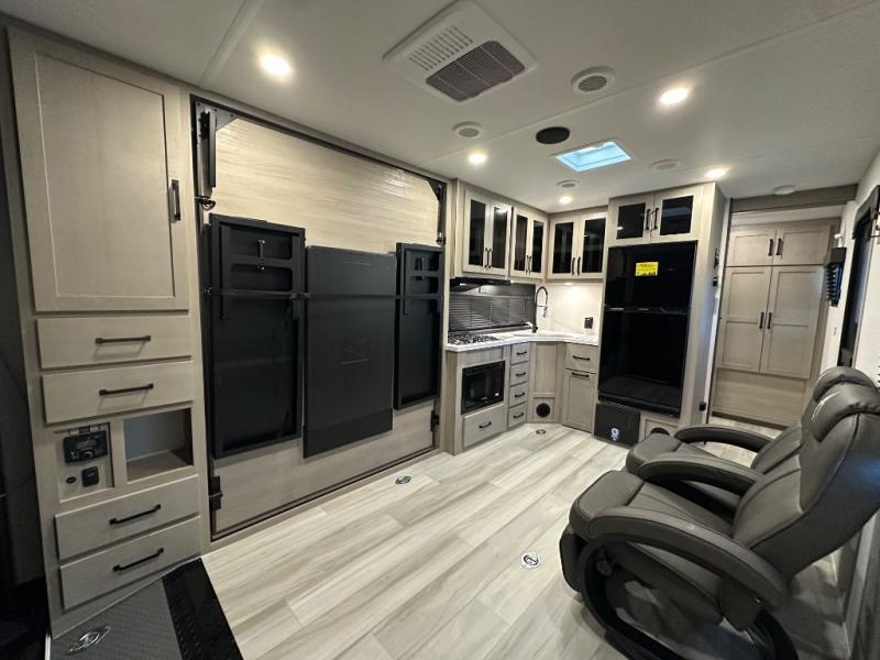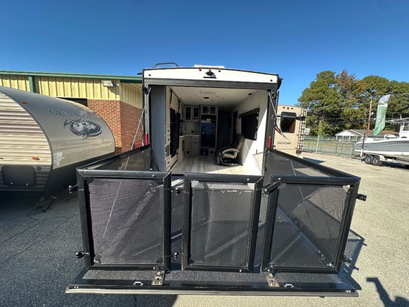 Get ready to take your adventures to the next level with this amazing toy Hauler. A spacious interior features a queen-sized murphy bed, perfect for relaxing after a long day of exploring. A convenient microwave and three-burner cooktop offer endless culinary possibilities, while a 12V 8cu. refrigerator keeps your essentials at the perfect temperature. Ample overhead cabinets provide additional storage for gear, cookware, and more. At the front of this toy hauler, a full bathroom with a closet provides a private retreat, and the ramp door/patio offers easy access to your toys and outdoor living space. Plus, a 13' awning offers shade and protection from the elements.