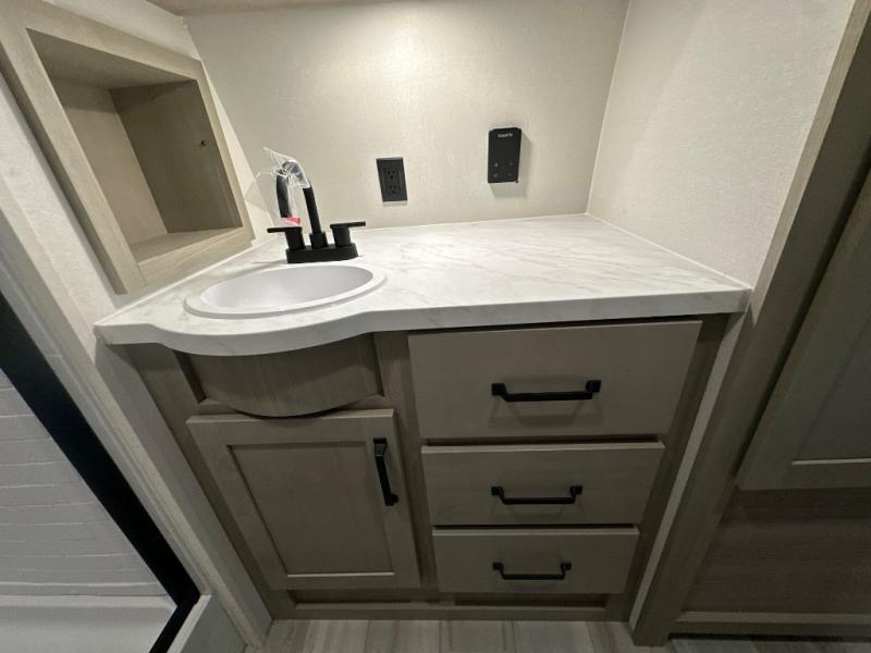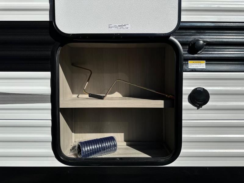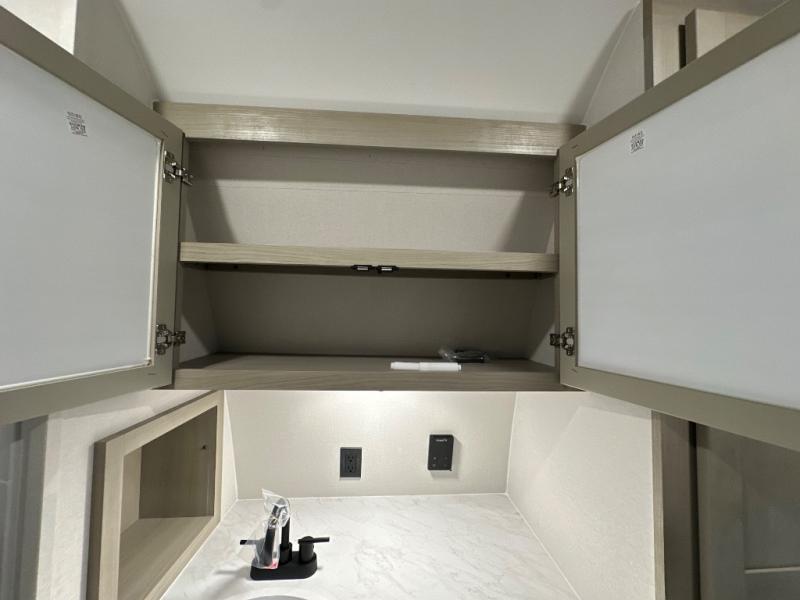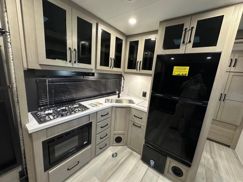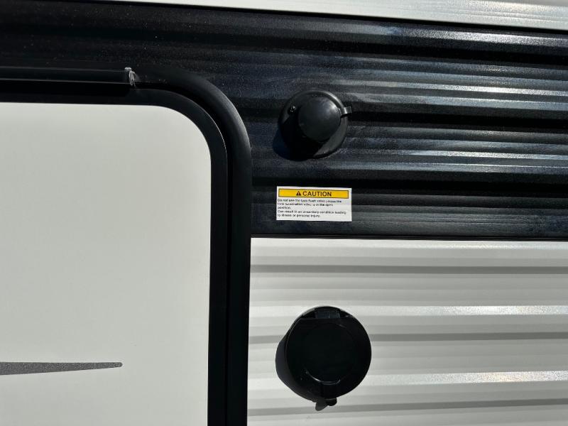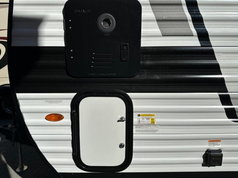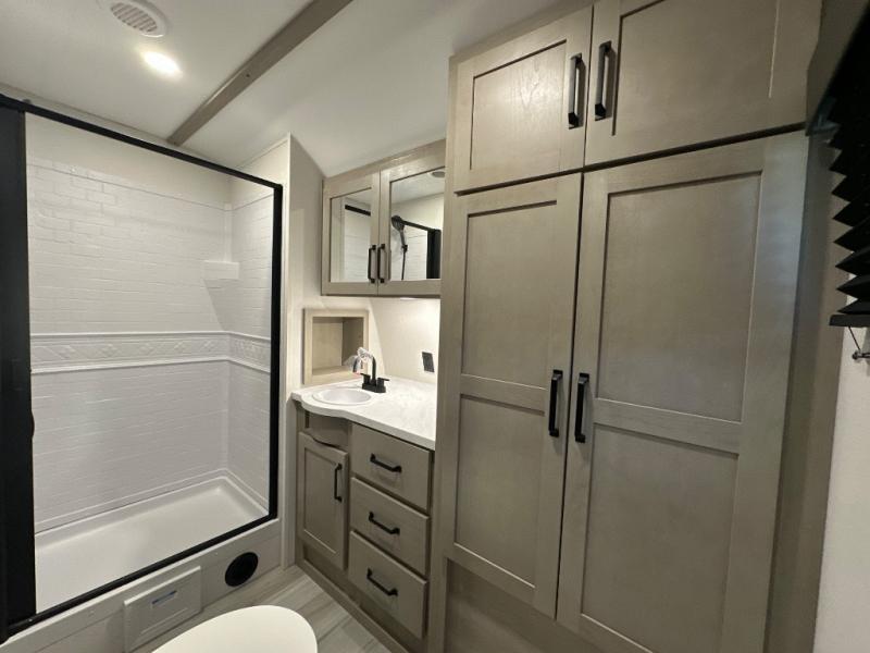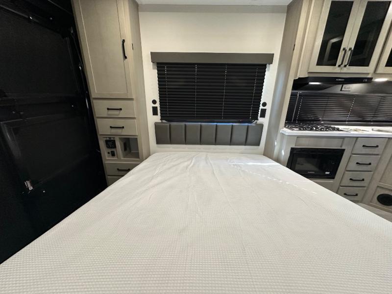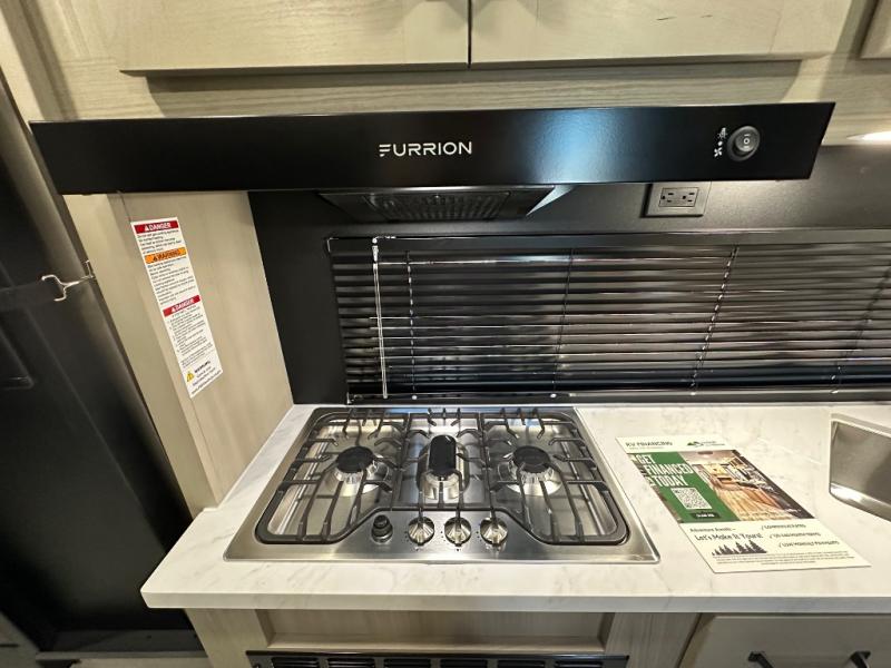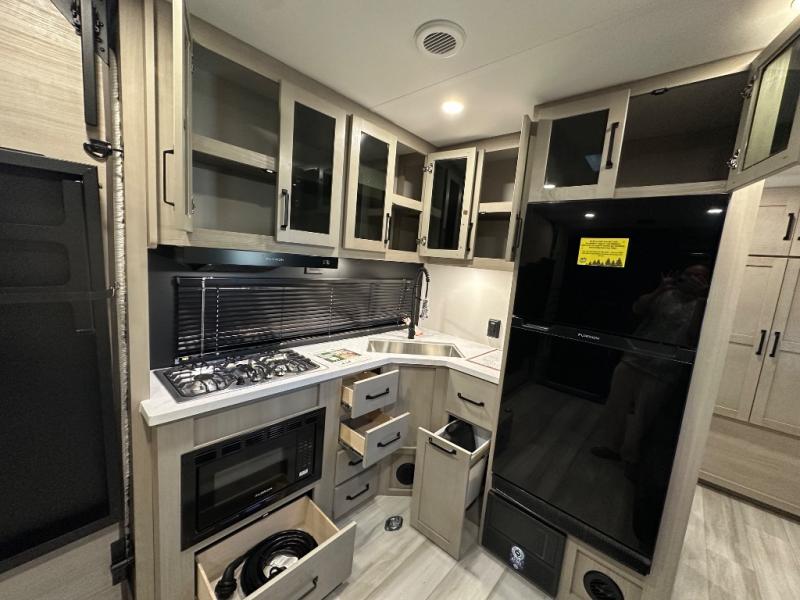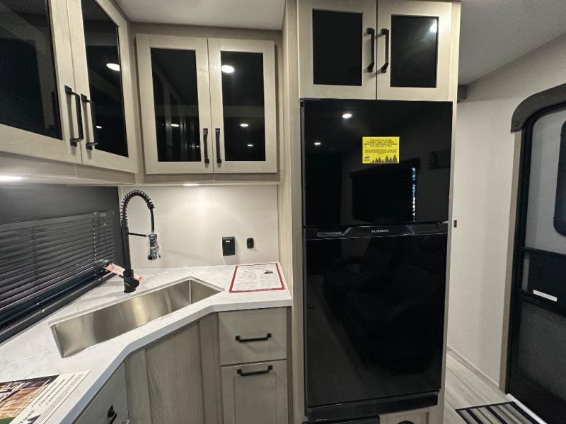 Get ready to take your adventures to the next level with this amazing toy Hauler. A spacious interior features a queen-sized murphy bed, perfect for relaxing after a long day of exploring. A convenient microwave and three-burner cooktop offer endless culinary possibilities, while a 12V 8cu. refrigerator keeps your essentials at the perfect temperature. Ample overhead cabinets provide additional storage for gear, cookware, and more. At the front of this toy hauler, a full bathroom with a closet provides a private retreat, and the ramp door/patio offers easy access to your toys and outdoor living space. Plus, a 13' awning offers shade and protection from the elements.