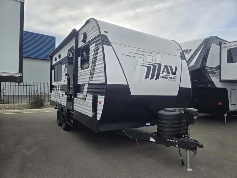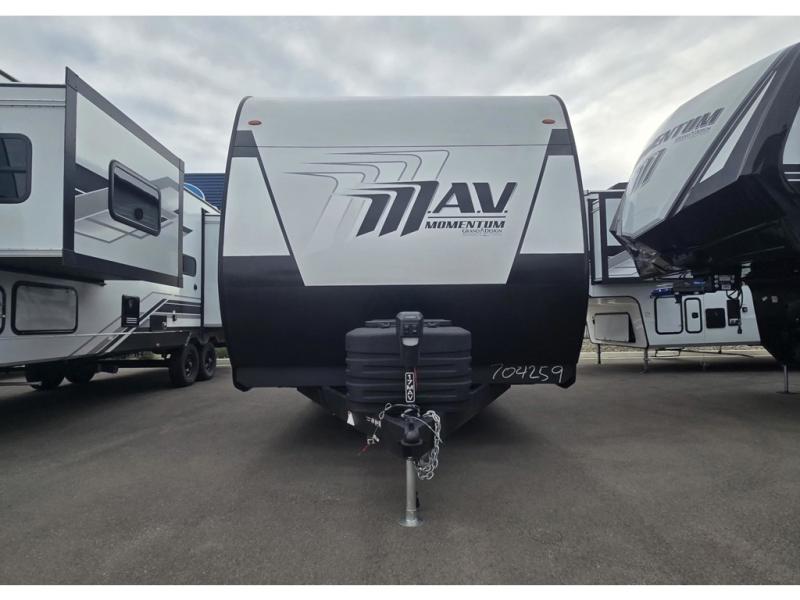 The Momentum MAV toy hauler travel trailers by Grand Design are designed to provide exactly what you need. The spacious garage provides tons of cargo space, with no wheel wells to get in the way. Additional storage includes magnetic storage door catches, and overhead consoles throughout. Conveniences like motion sensor lights and USB outlets will make your life easier, and you will be comfortable in all seasons with the 30K BTU furnace plus 15K BTU ducted air conditioning. The standard Solar Package comes with a 180W solar panel, a 40 Amp charge controller with Bluetooth, and a 12V refrigerator so you can go off-grid when the adventure calls for it.