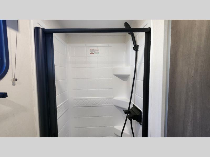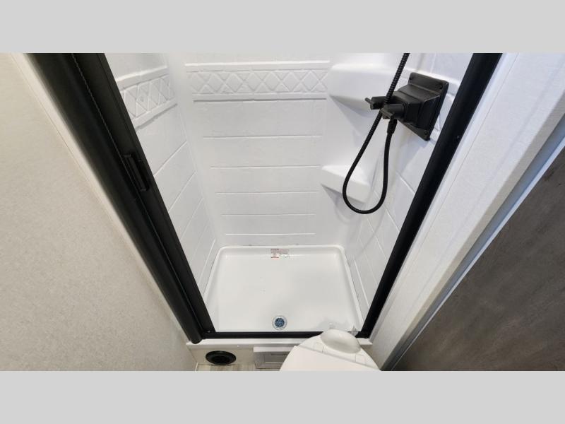 Spacious shower with skylight, vanity, and foot-flush toilet — because real campers don’t do bathhouse lines.