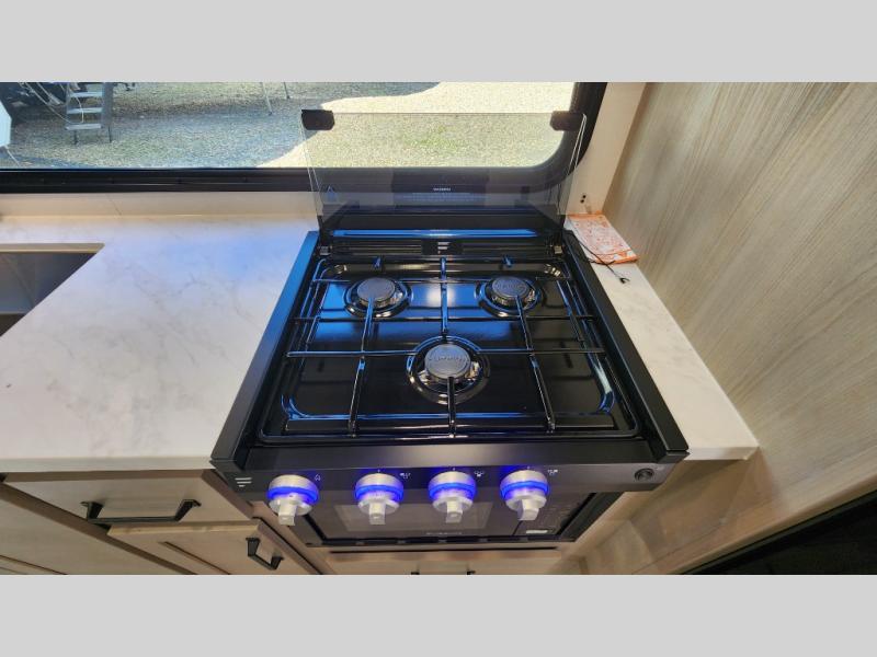 Residential microwave, 3-burner range with oven, deep sink, and 12V refrigerator for campsite cooking made easy.