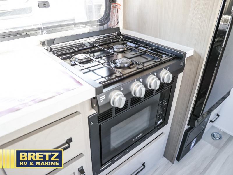 Head for the lake in this toy hauler that can sleep five campers each night. Your crew can relax on the rollover sofa with a table, and the top bed will be perfect for your guests to sleep on. The front corner queen Murphy bed includes drawers to store clothes, plus overhead storage for personal belongings. In the morning, you can prepare breakfast on the three burner range with an oven, pour yourself milk from the 12V 8 cu. ft. refrigerator, then relax on the dual Euro chairs. This model also includes a patio with a pull down screen to let fresh air in without letting the bugs in!