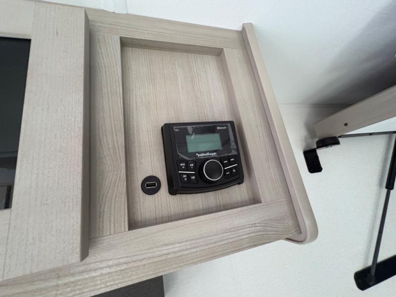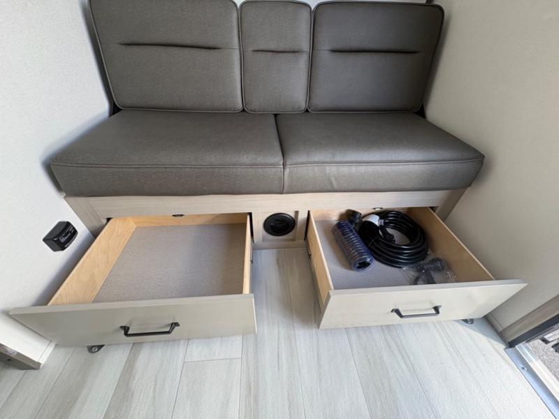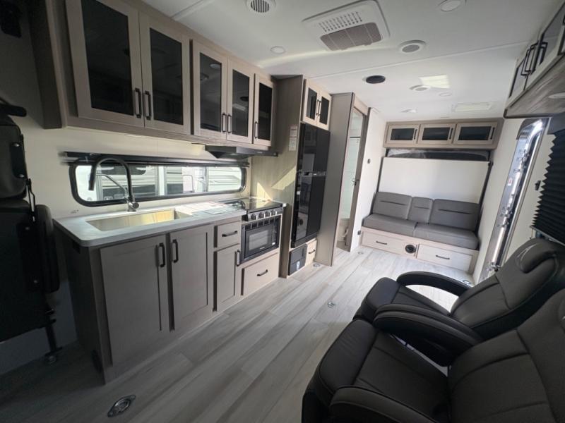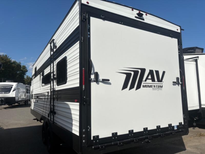 The Momentum MAV toy hauler travel trailers by Grand Design are designed to provide exactly what you need. The spacious garage provides tons of cargo space, with no wheel wells to get in the way. Additional storage includes magnetic storage door catches, and overhead consoles throughout. Conveniences like motion sensor lights and USB outlets will make your life easier, and you will be comfortable in all seasons with the 30K BTU furnace plus 15K BTU ducted air conditioning. The standard Solar Package comes with a 180W solar panel, a 40 Amp charge controller with Bluetooth, and a 12V refrigerator so you can go off-grid when the adventure calls for it.