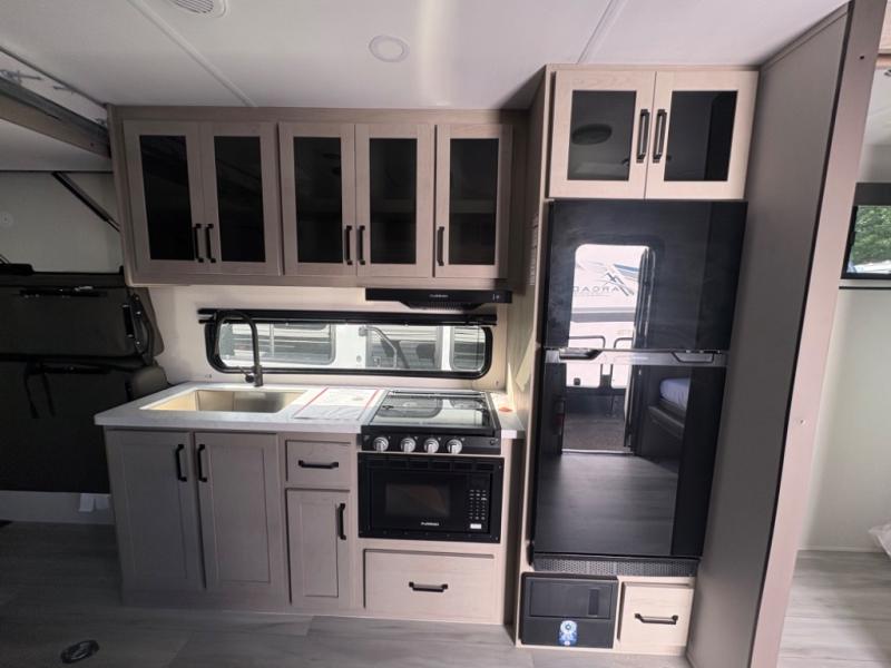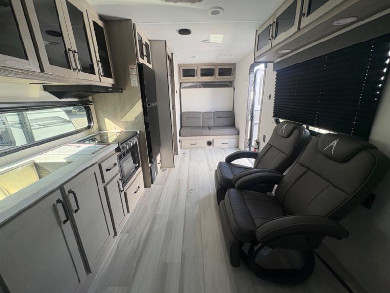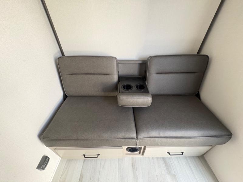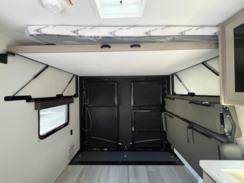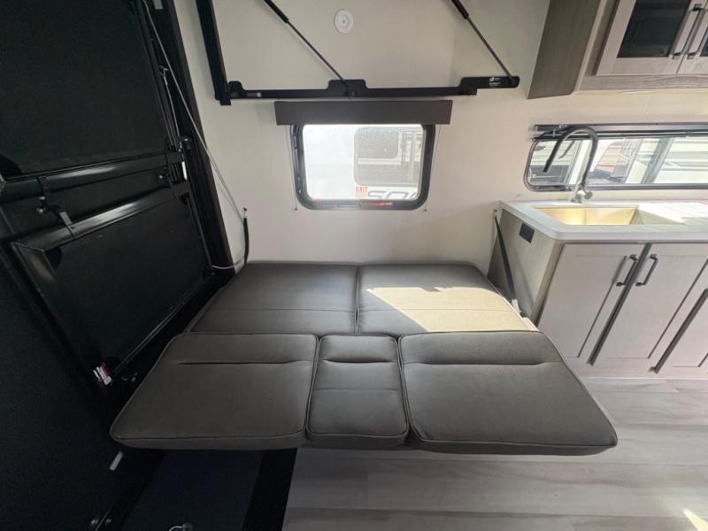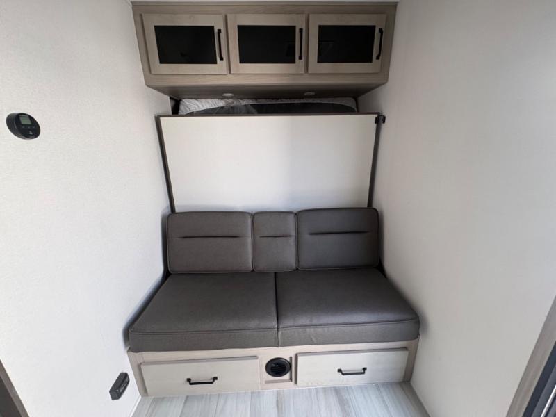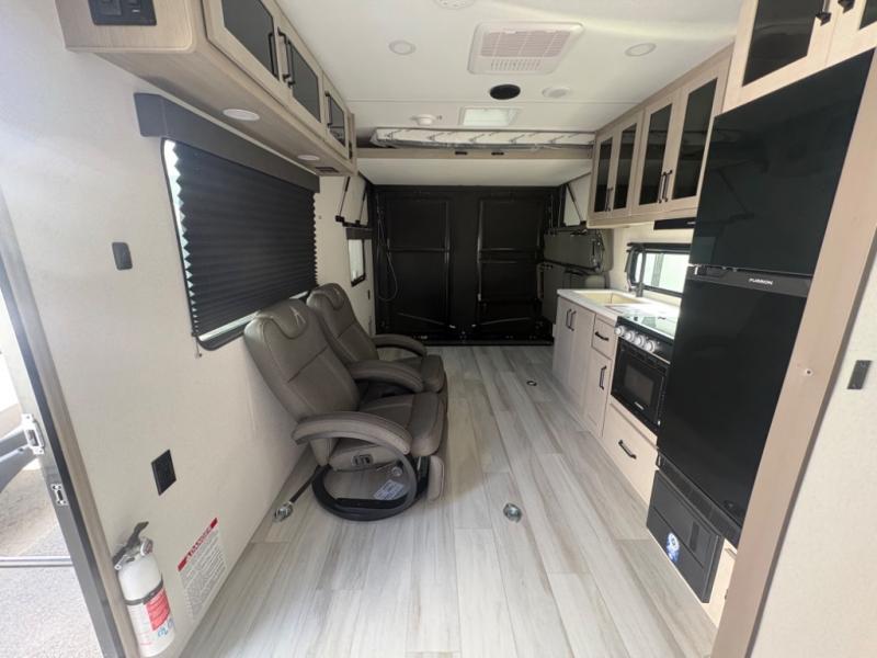Head for the lake in this toy hauler that can sleep five campers each night. Your crew can relax on the rollover sofa with a table, and the top bed will be perfect for your guests to sleep on. The front corner queen Murphy bed includes drawers to store clothes, plus overhead storage for personal belongings. In the morning, you can prepare breakfast on the three burner range with an oven, pour yourself milk from the 12V 8 cu. ft. refrigerator, then relax on the dual Euro chairs. This model also includes a patio with a pull down screen to let fresh air in without letting the bugs in!