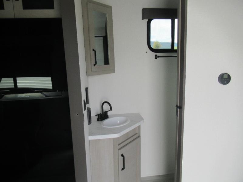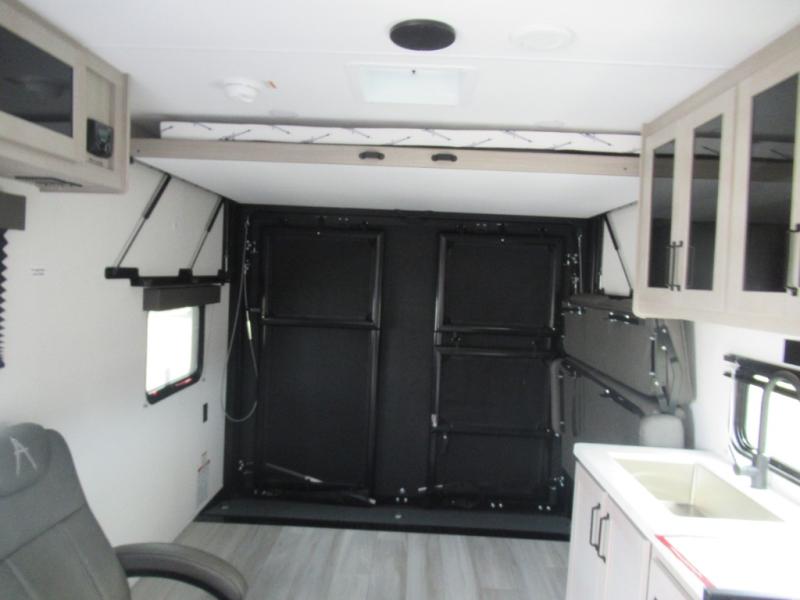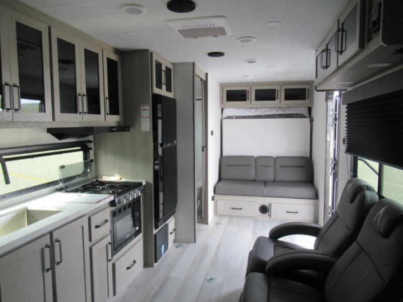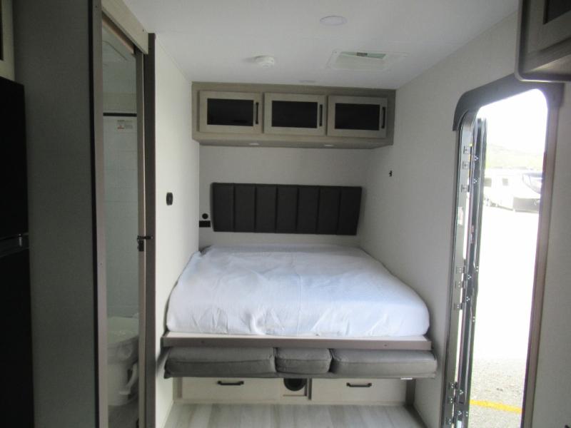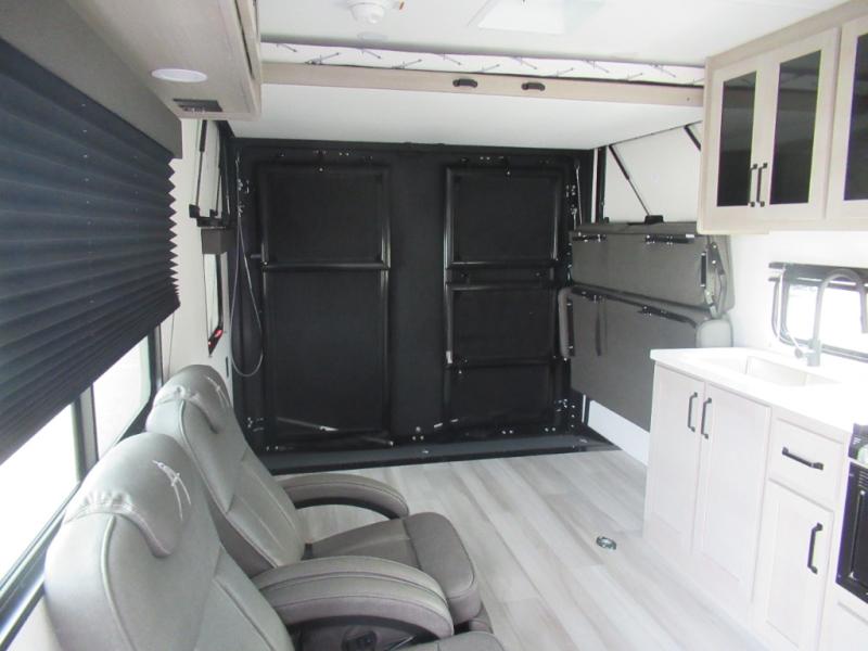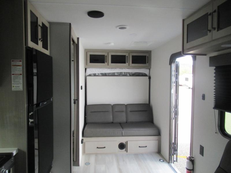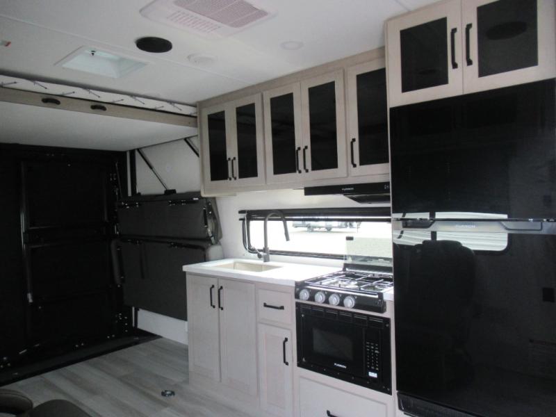 Head for the lake in this toy hauler that can sleep five campers each night. Your crew can relax on the rollover sofa with a table, and the top bed will be perfect for your guests to sleep on. The front corner queen Murphy bed includes drawers to store clothes, plus overhead storage for personal belongings. In the morning, you can prepare breakfast on the three burner range with an oven, pour yourself milk from the 12V 8 cu. ft. refrigerator, then relax on the dual Euro chairs. This model also includes a patio with a pull down screen to let fresh air in without letting the bugs in!