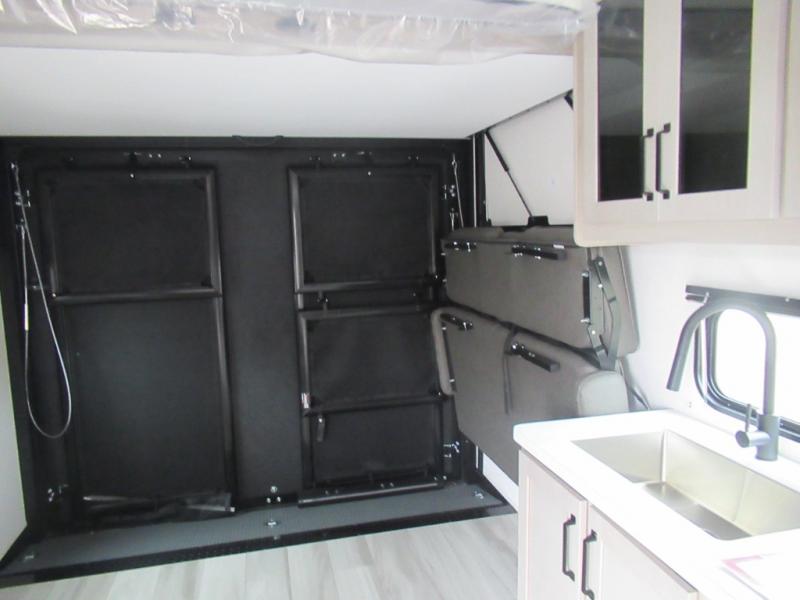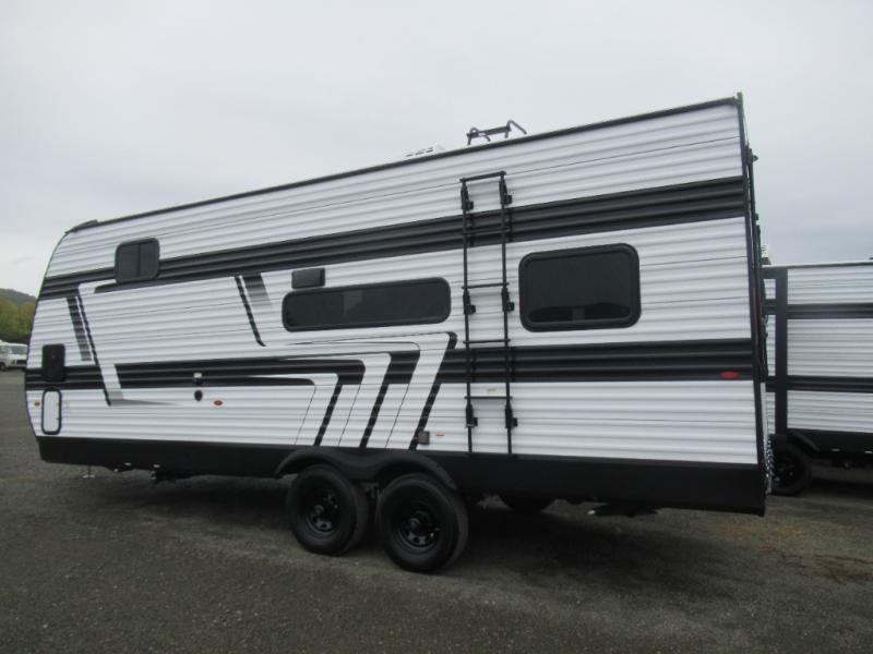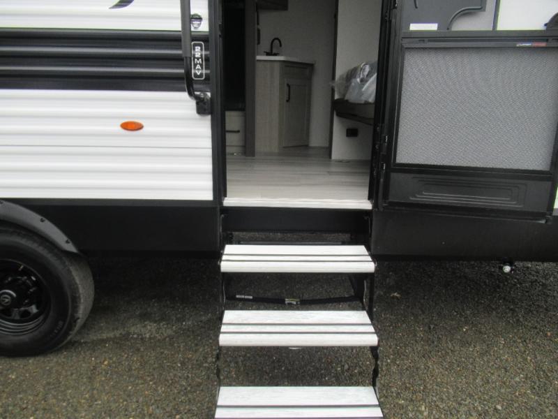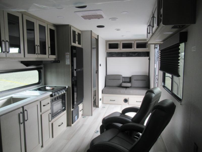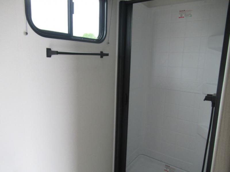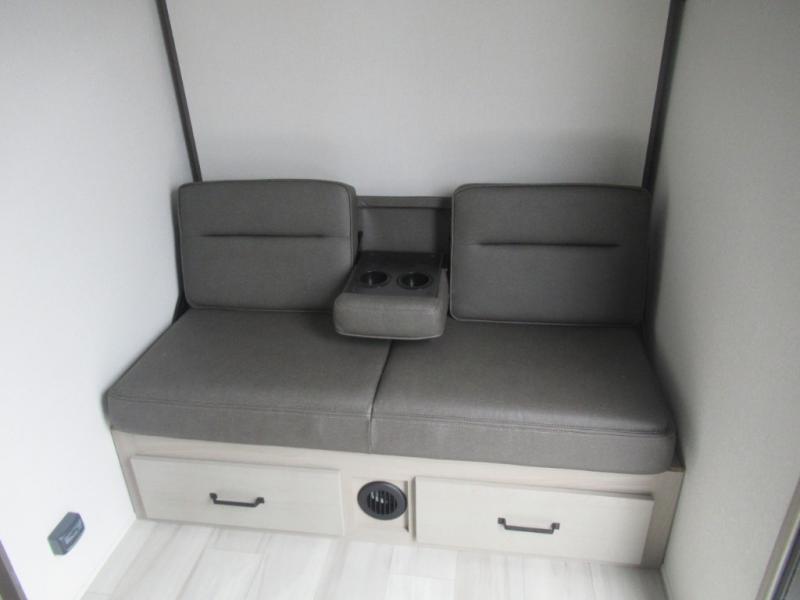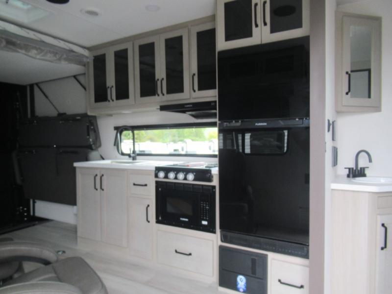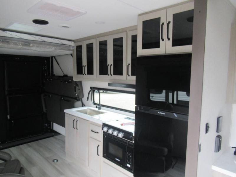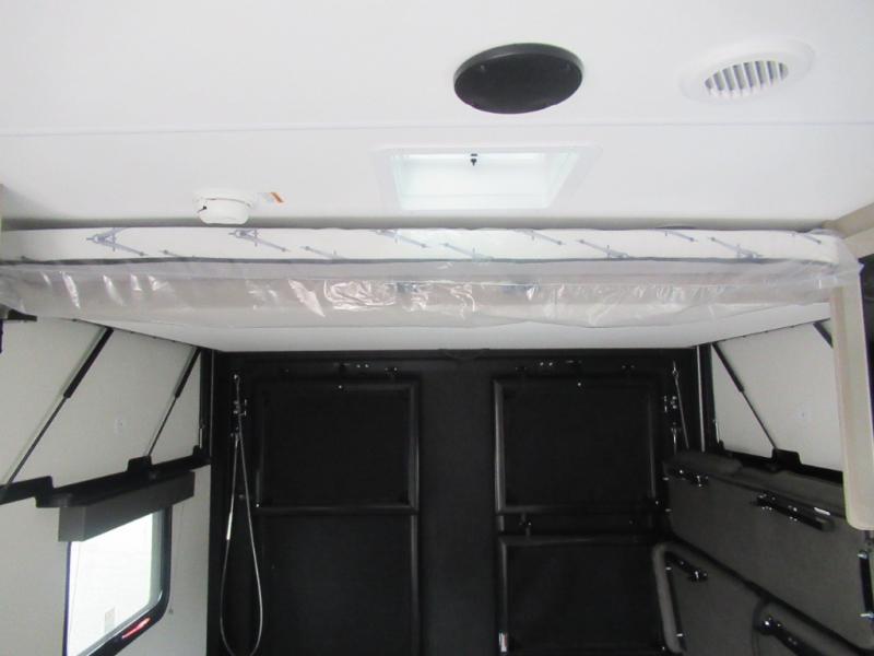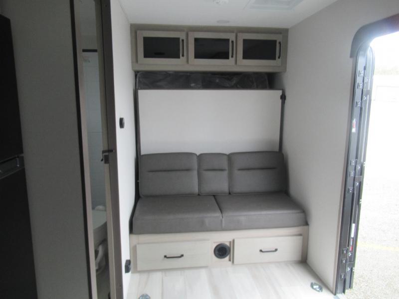 Head for the lake in this toy hauler that can sleep five campers each night. Your crew can relax on the rollover sofa with a table, and the top bed will be perfect for your guests to sleep on. The front corner queen Murphy bed includes drawers to store clothes, plus overhead storage for personal belongings. In the morning, you can prepare breakfast on the three burner range with an oven, pour yourself milk from the 12V 8 cu. ft. refrigerator, then relax on the dual Euro chairs. This model also includes a patio with a pull down screen to let fresh air in without letting the bugs in!