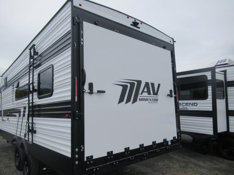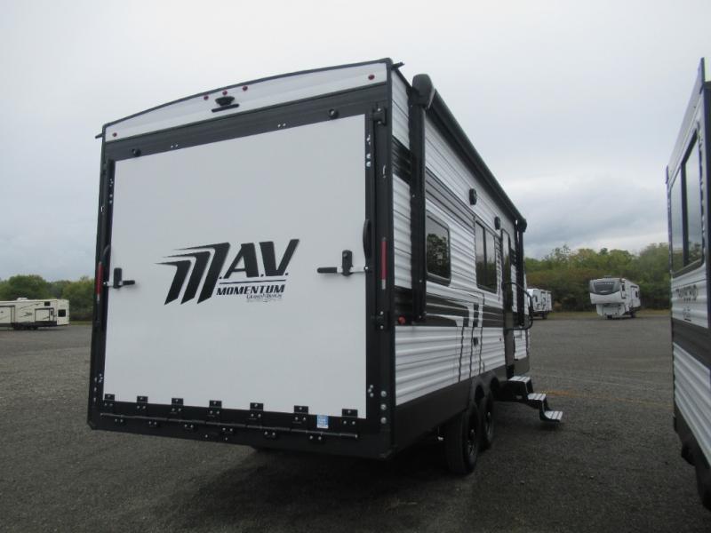 The Momentum MAV toy hauler travel trailers by Grand Design are designed to provide exactly what you need. The spacious garage provides tons of cargo space, with no wheel wells to get in the way. Additional storage includes magnetic storage door catches, and overhead consoles throughout. Conveniences like motion sensor lights and USB outlets will make your life easier, and you will be comfortable in all seasons with the 30K BTU furnace plus 15K BTU ducted air conditioning. The standard Solar Package comes with a 180W solar panel, a 40 Amp charge controller with Bluetooth, and a 12V refrigerator so you can go off-grid when the adventure calls for it.