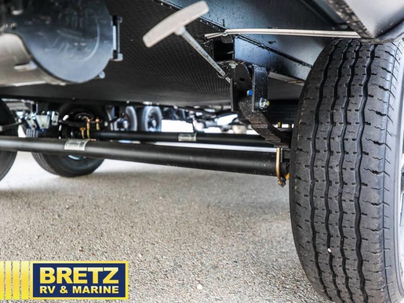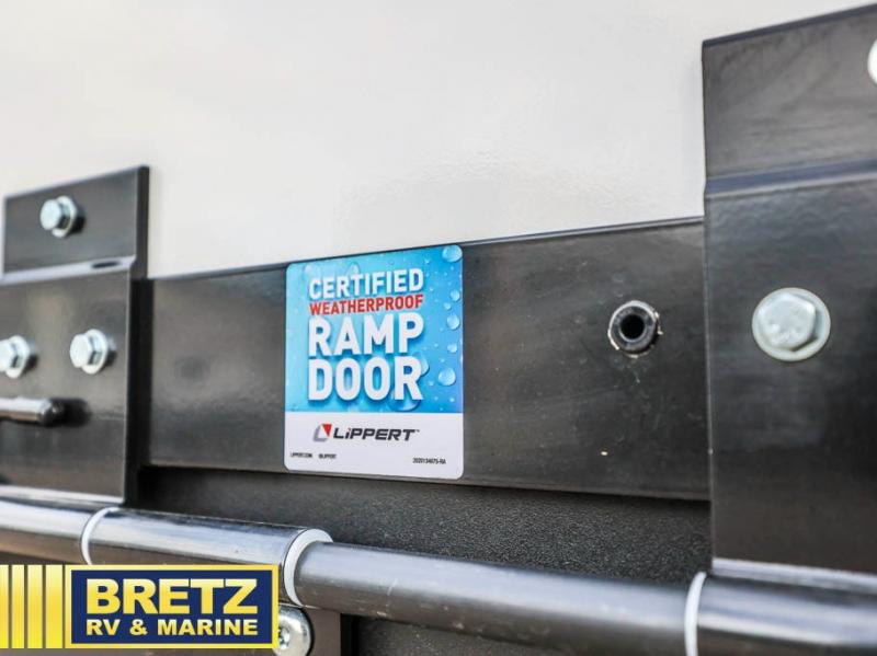 Head for the lake in this toy hauler that can sleep five campers each night. Your crew can relax on the rollover sofa with a table, and the top bed will be perfect for your guests to sleep on. The front corner queen Murphy bed includes drawers to store clothes, plus overhead storage for personal belongings. In the morning, you can prepare breakfast on the three burner range with an oven, pour yourself milk from the 12V 8 cu. ft. refrigerator, then relax on the dual Euro chairs. This model also includes a patio with a pull down screen to let fresh air in without letting the bugs in!