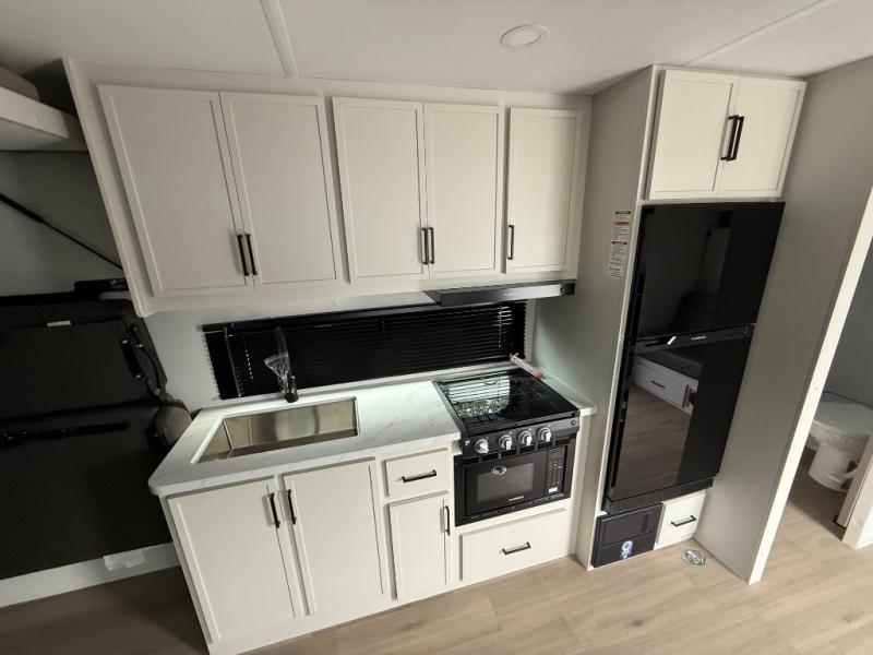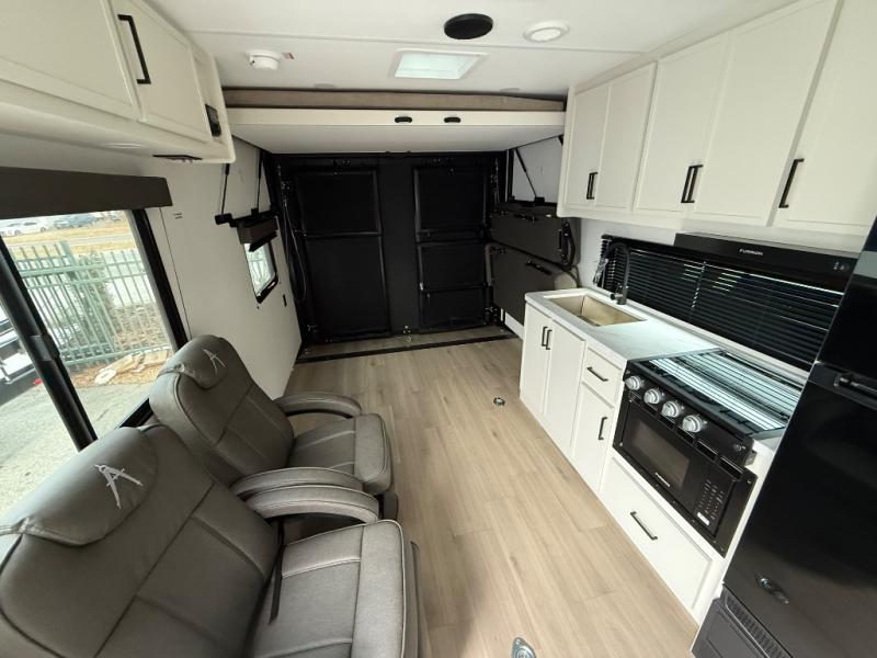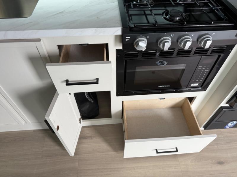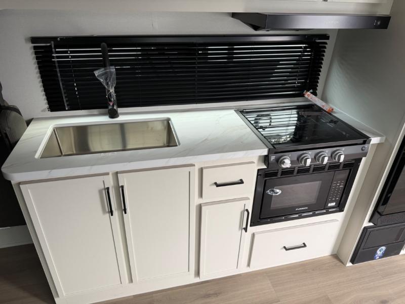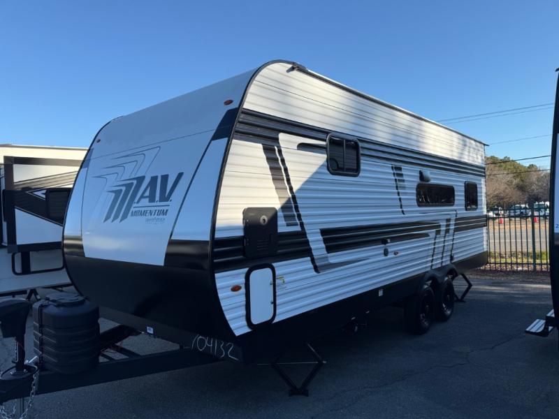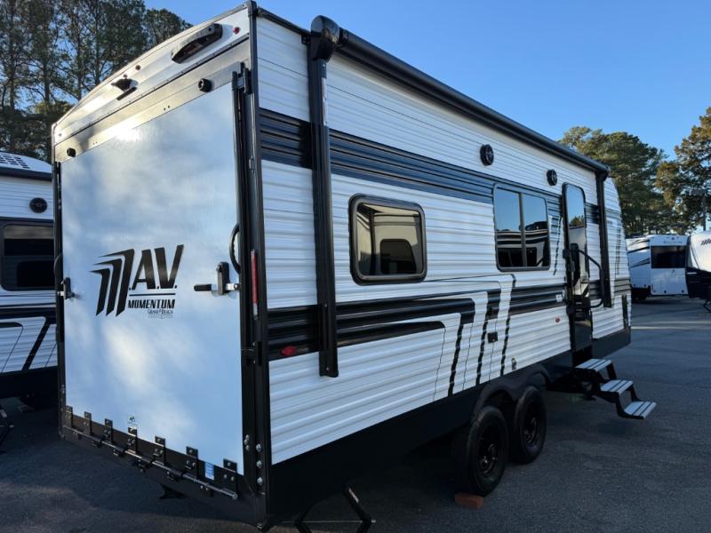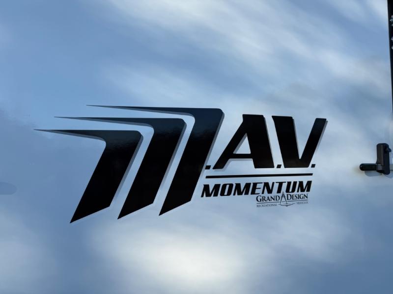 The Momentum MAV toy hauler travel trailers by Grand Design are designed to provide exactly what you need. The spacious garage provides tons of cargo space, with no wheel wells to get in the way. Additional storage includes magnetic storage door catches, and overhead consoles throughout. Conveniences like motion sensor lights and USB outlets will make your life easier, and you will be comfortable in all seasons with the 30K BTU furnace plus 15K BTU ducted air conditioning. The standard Solar Package comes with a 180W solar panel, a 40 Amp charge controller with Bluetooth, and a 12V refrigerator so you can go off-grid when the adventure calls for it.