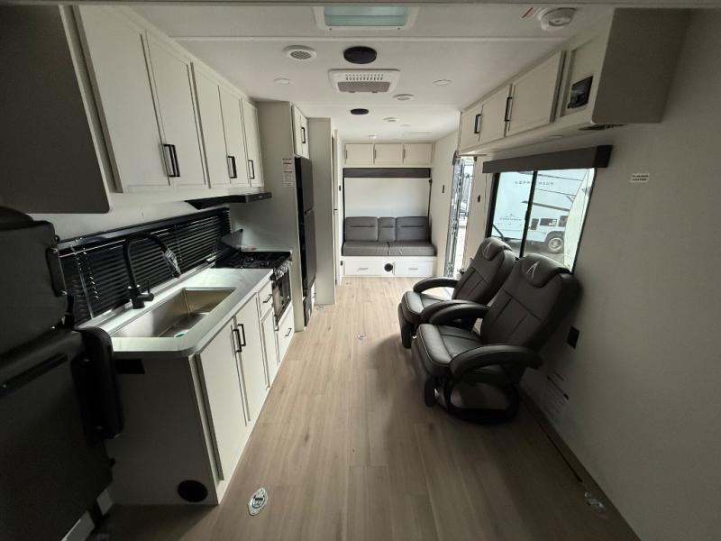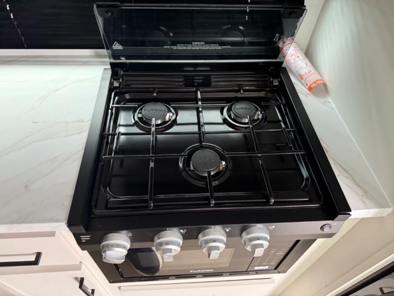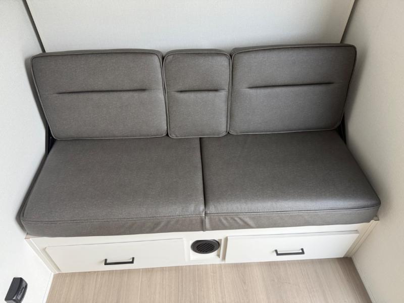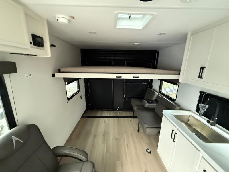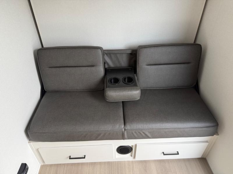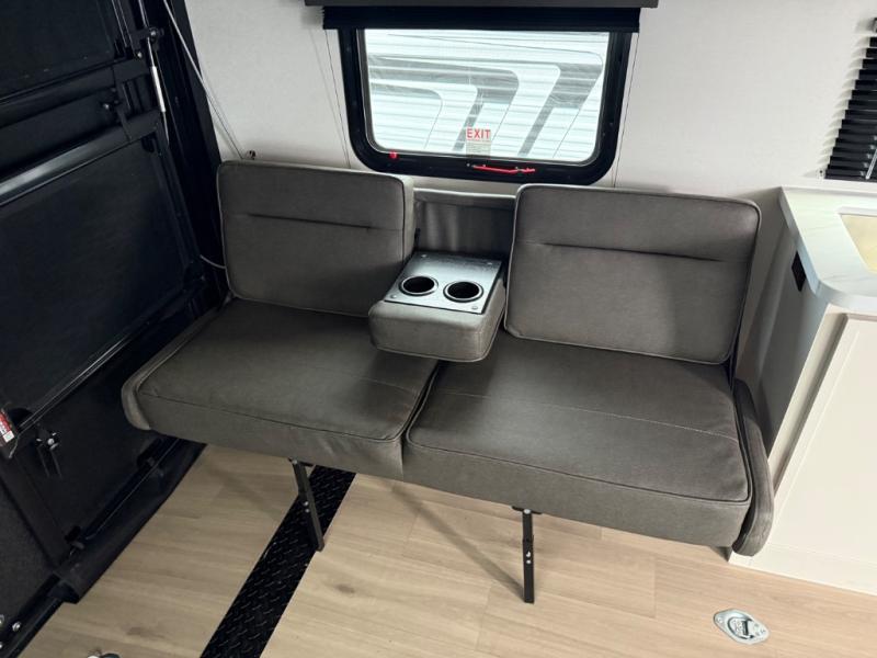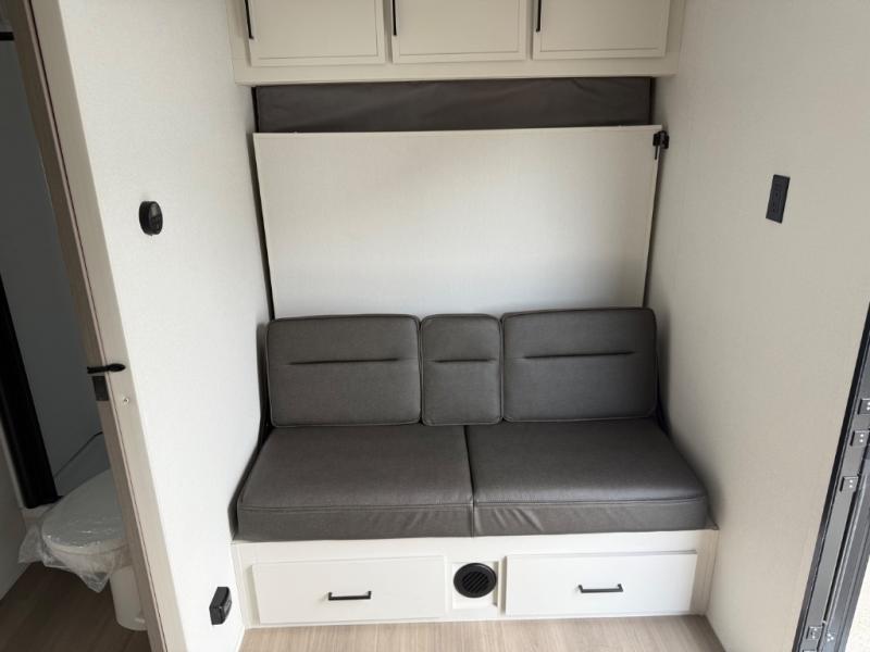 Head for the lake in this toy hauler that can sleep five campers each night. Your crew can relax on the rollover sofa with a table, and the top bed will be perfect for your guests to sleep on. The front corner queen Murphy bed includes drawers to store clothes, plus overhead storage for personal belongings. In the morning, you can prepare breakfast on the three burner range with an oven, pour yourself milk from the 12V 8 cu. ft. refrigerator, then relax on the dual Euro chairs. This model also includes a patio with a pull down screen to let fresh air in without letting the bugs in!
