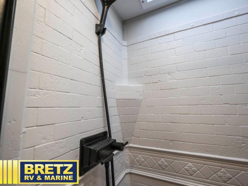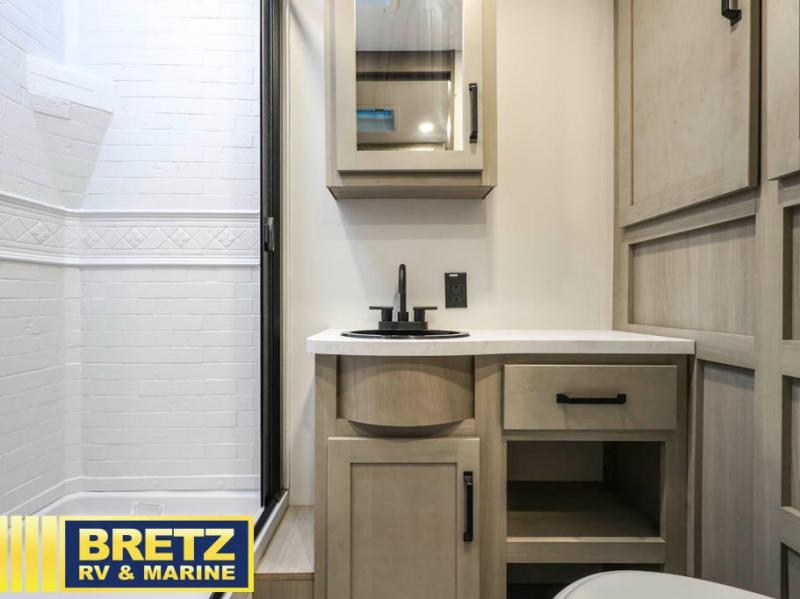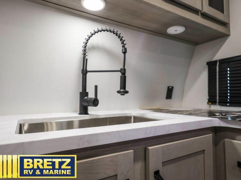 This is the perfect toy hauler for two campers looking for adventure! Once your toys are unloaded using the ramp door, you will enjoy the patio system that will provide more living space. The queen Murphy bed will provide seating and sleeping space, and there is TV prep across from the bed if you want the option to watch movies in bed. Head to the front corner kitchen to make lunch on the three burner range, and leftovers can go in the 8 cu. ft. 12V refrigerator. You'll find the full bath in the other front corner, which will allow you to freshen up after a day of trail riding! This model also includes a fold-up dinette where you can dine each day, or you can take your plate outdoors to sit under the 17' power awning!