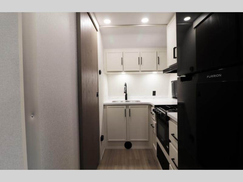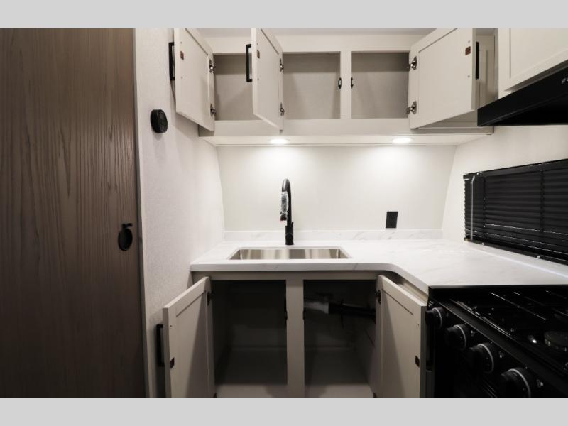 • Fully Equipped Living Space includes a 12V 8 cu ft refrigerator, microwave, 3-burner range, deep-seated stainless steel sink, and solid wood drawer fronts — all the conveniences of home on the road.