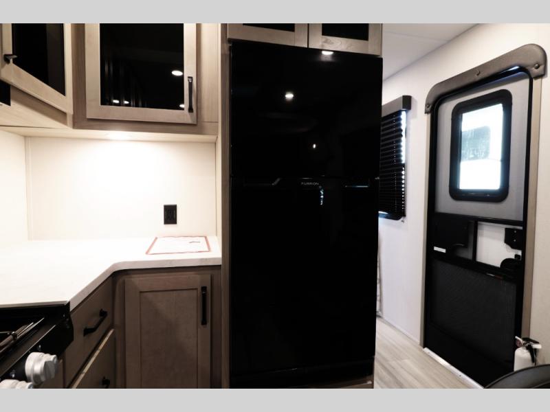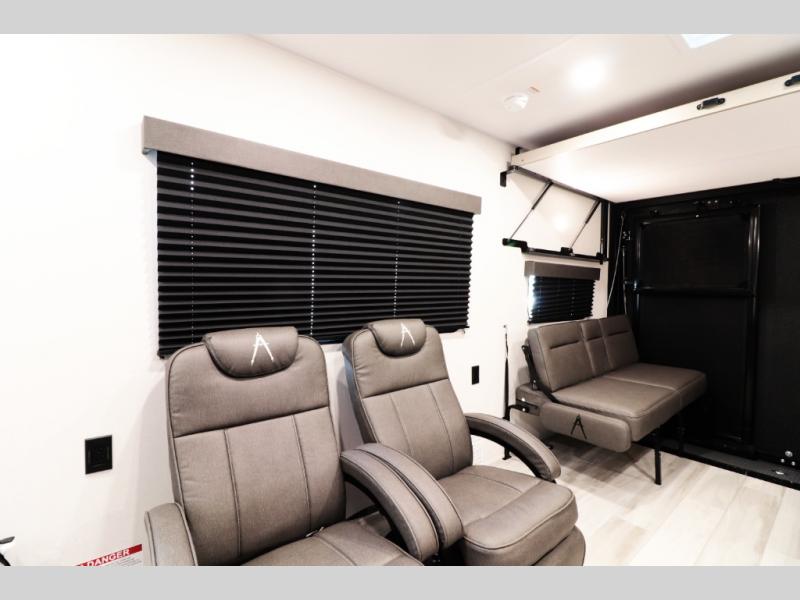 Premium touches inside: Solid hardwood cabinetry, residential countertops, full extension drawer glides, large solid bedroom door, multiple USB ports, upgraded furniture—these elevate the feel beyond “just a toy hauler.”