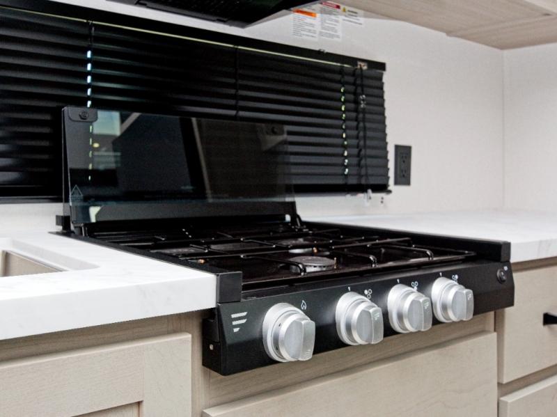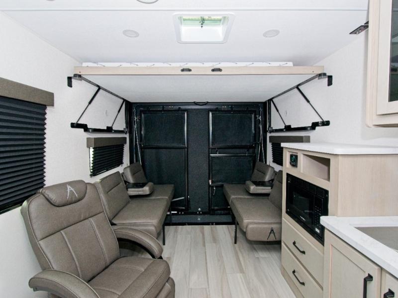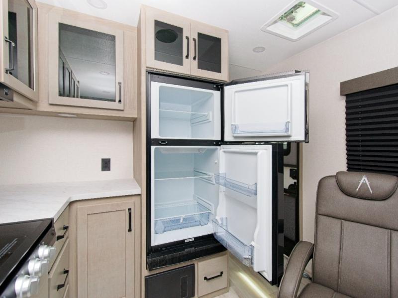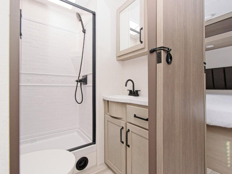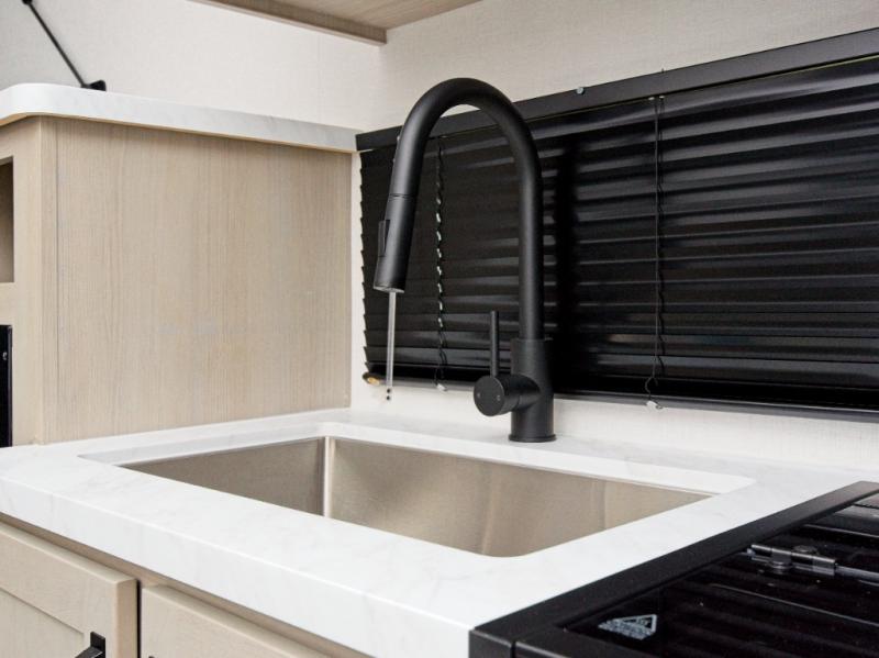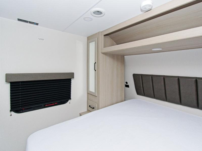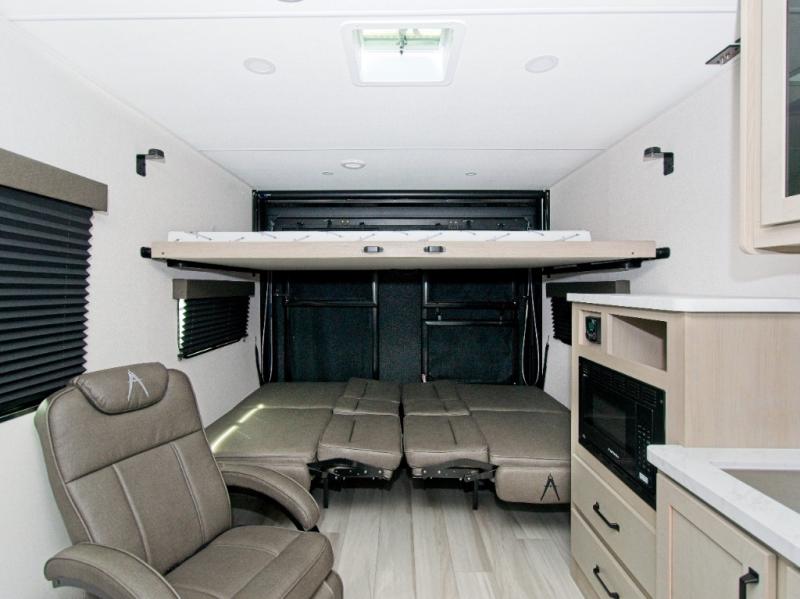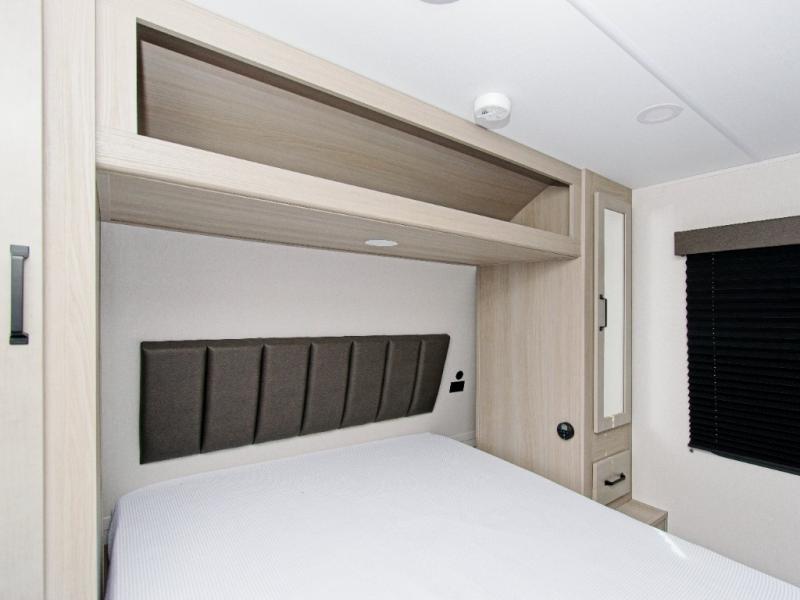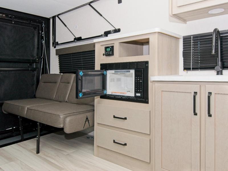 Up front, enjoy a private queen bedroom with walkaround space, dual nightstands, and a wardrobe with drawers and hanging storage. The kitchen includes a microwave, stainless steel sink, and a 12V refrigerator, making meal prep easy wherever you roam.