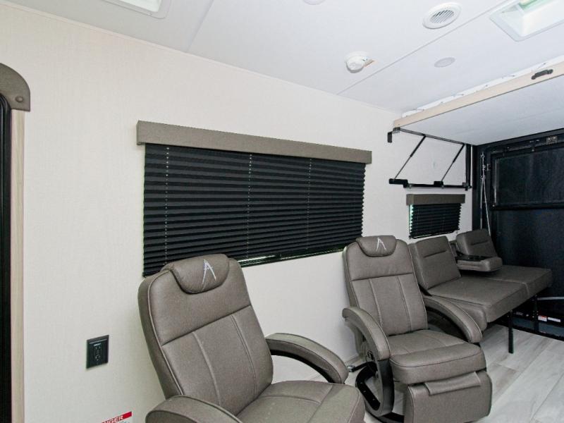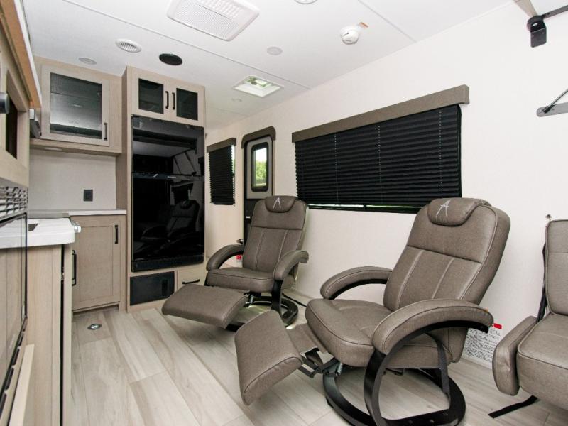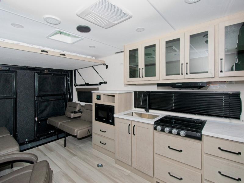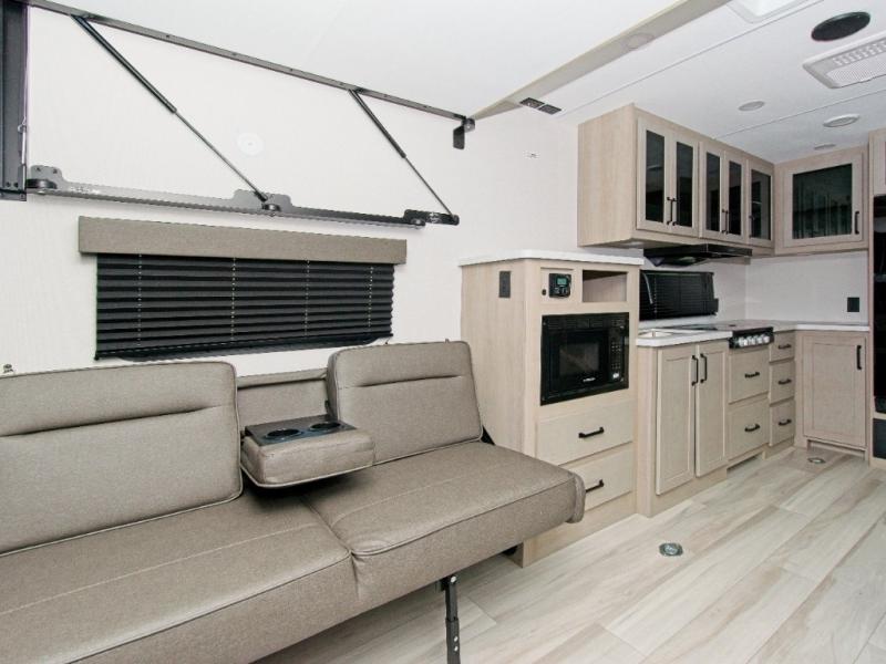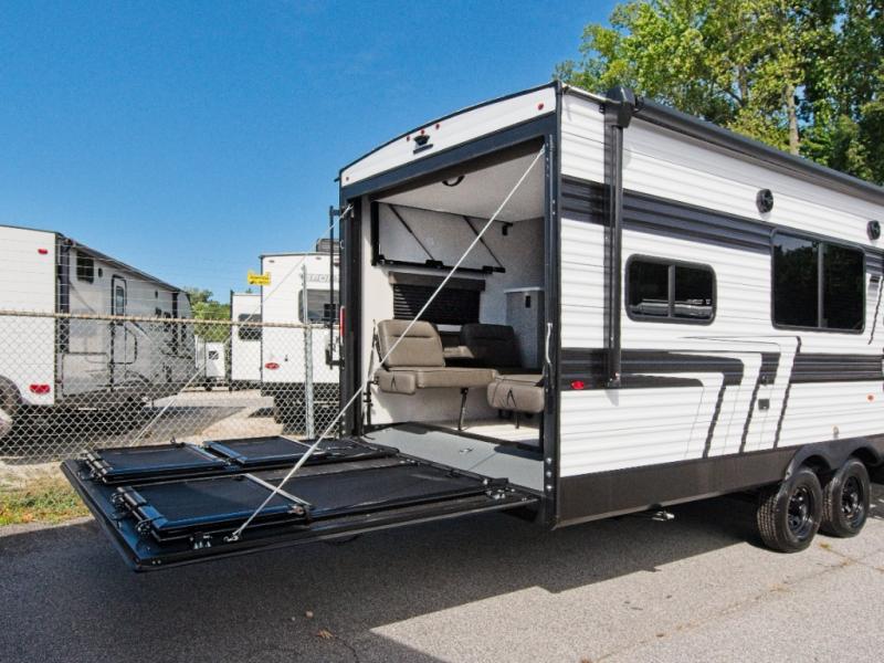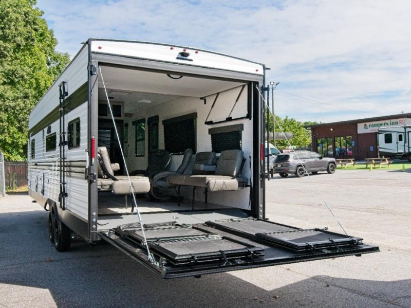 The Momentum MAV 27MAV is built for thrill-seekers who don’t want to sacrifice comfort. The 13' 6" garage offers plenty of space for ATVs, dirt bikes, or kayaks, and easily transforms into a cozy lounge or sleeping area with rollover sofas, a removable table, and an overhead bed. The ramp door doubles as a patio, giving you extra outdoor living space with a pull-down screen to keep the bugs out.
