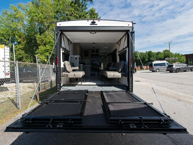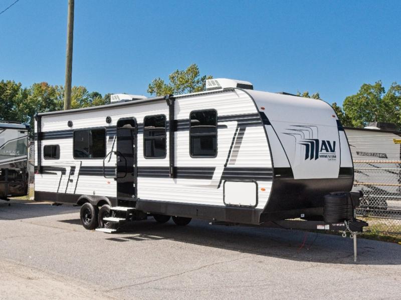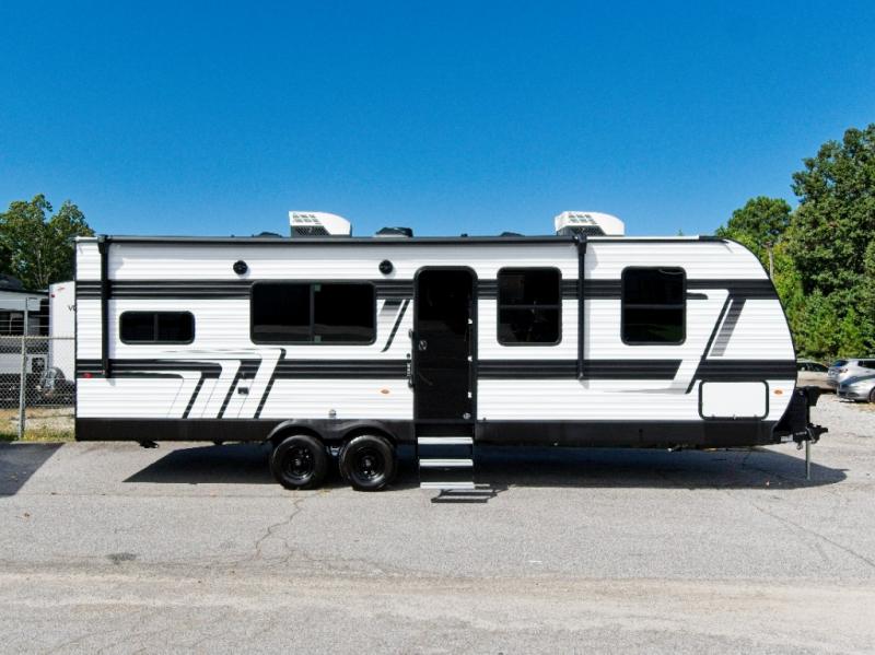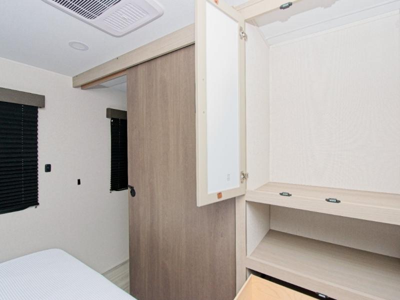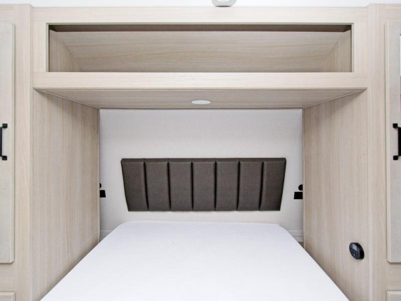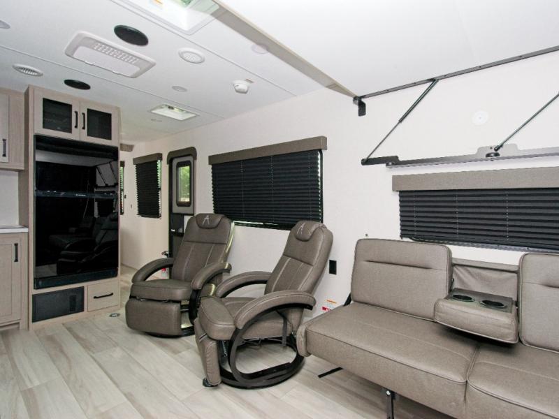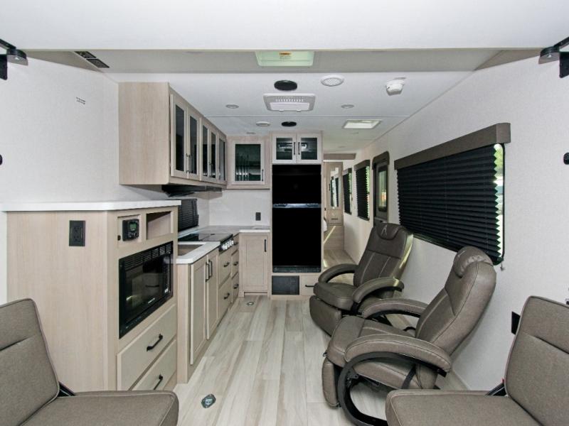 The Momentum MAV 27MAV is built for thrill-seekers who don’t want to sacrifice comfort. The 13' 6" garage offers plenty of space for ATVs, dirt bikes, or kayaks, and easily transforms into a cozy lounge or sleeping area with rollover sofas, a removable table, and an overhead bed. The ramp door doubles as a patio, giving you extra outdoor living space with a pull-down screen to keep the bugs out.