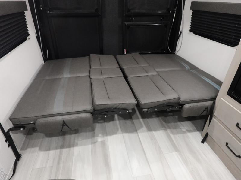 You will love this Momentum MAV toy hauler travel trailer! The front bedroom features a queen bed, and there is plenty of room to walk around. The sliding solid bedroom door helps with space. Overhead storage and a pair of nightstands are convenient storage, plus there is a wardrobe with both drawers and space to hang items. The kitchen offers a microwave, stainless steel sink, and an 8 cu. ft. 12V refrigerator. In the garage, you'll find rollover sofas with a table and a top bed for guests to sleep on. The ramp door/patio will provide additional living space once your toys are unloaded, and the pull down screen will keep bugs out!