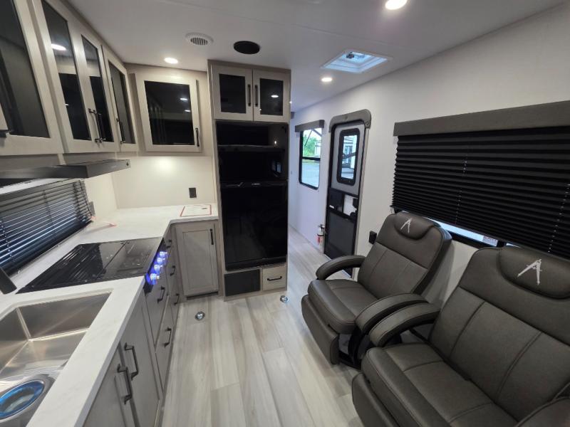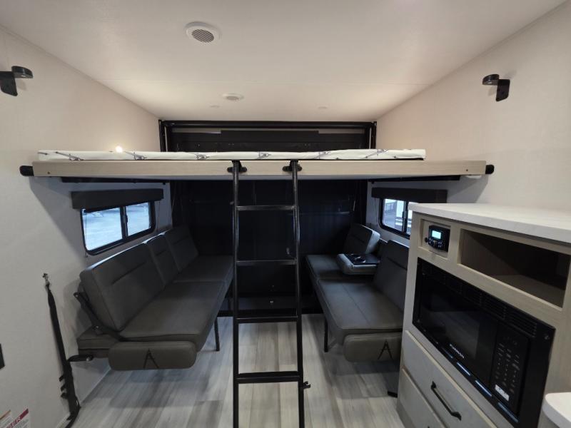 You will love this Momentum MAV toy hauler travel trailer! The front bedroom features a queen bed, and there is plenty of room to walk around. The sliding solid bedroom door helps with space. Overhead storage and a pair of nightstands are convenient storage, plus there is a wardrobe with both drawers and space to hang items. The kitchen offers a microwave, stainless steel sink, and an 8 cu. ft. 12V refrigerator. In the garage, you'll find rollover sofas with a table and a top bed for guests to sleep on. The ramp door/patio will provide additional living space once your toys are unloaded, and the pull down screen will keep bugs out!