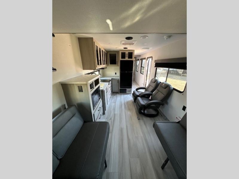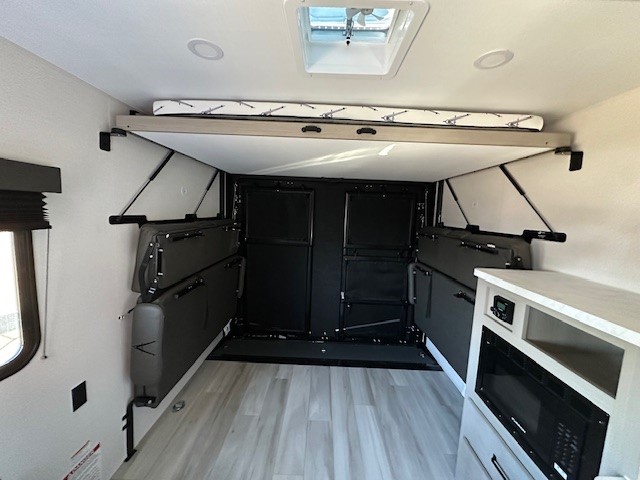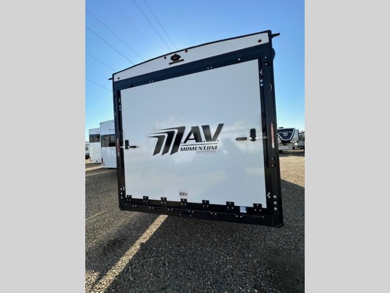 You will love this Momentum MAV toy hauler travel trailer! The front bedroom features a queen bed, and there is plenty of room to walk around. The sliding solid bedroom door helps with space. Overhead storage and a pair of nightstands are convenient storage, plus there is a wardrobe with both drawers and space to hang items. The kitchen offers a microwave, stainless steel sink, and an 8 cu. ft. 12V refrigerator. In the garage, you'll find rollover sofas with a table and a top bed for guests to sleep on. The ramp door/patio will provide additional living space once your toys are unloaded, and the pull down screen will keep bugs out!