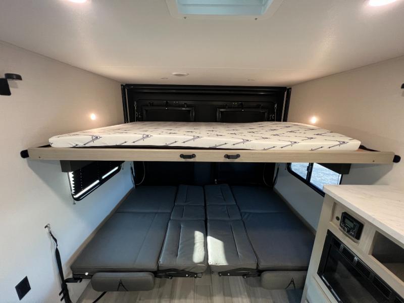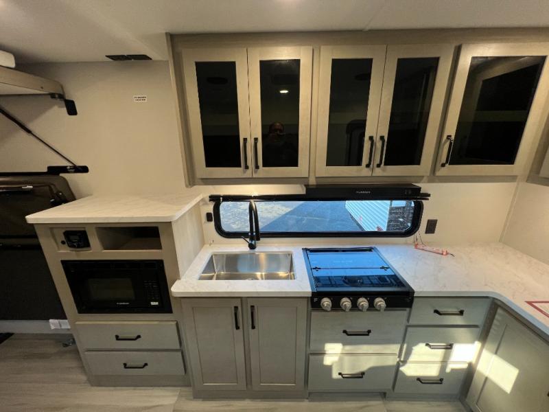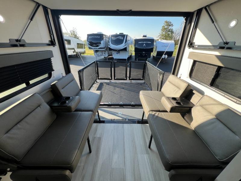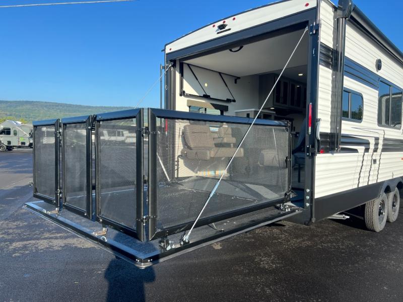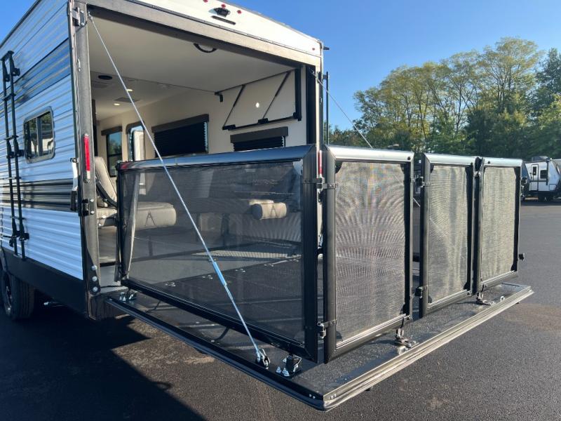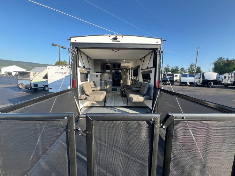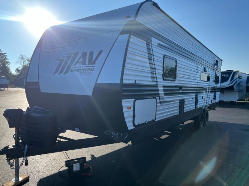 You will love this Momentum MAV toy hauler travel trailer! The front bedroom features a queen bed, and there is plenty of room to walk around. The sliding solid bedroom door helps with space. Overhead storage and a pair of nightstands are convenient storage, plus there is a wardrobe with both drawers and space to hang items. The kitchen offers a microwave, stainless steel sink, and an 8 cu. ft. 12V refrigerator. In the garage, you'll find rollover sofas with a table and a top bed for guests to sleep on. The ramp door/patio will provide additional living space once your toys are unloaded, and the pull down screen will keep bugs out!