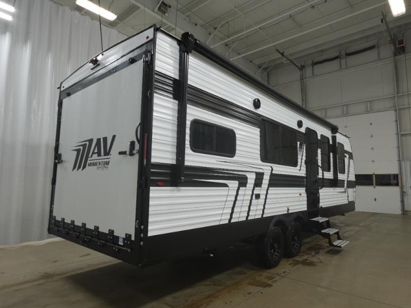 The Momentum MAV toy hauler travel trailers by Grand Design are designed to provide exactly what you need. The spacious garage provides tons of cargo space, with no wheel wells to get in the way. Additional storage includes magnetic storage door catches, and overhead consoles throughout. Conveniences like motion sensor lights and USB outlets will make your life easier, and you will be comfortable in all seasons with the 30K BTU furnace plus 15K BTU ducted air conditioning. The standard Solar Package comes with a 180W solar panel, a 40 Amp charge controller with Bluetooth, and a 12V refrigerator so you can go off-grid when the adventure calls for it.
