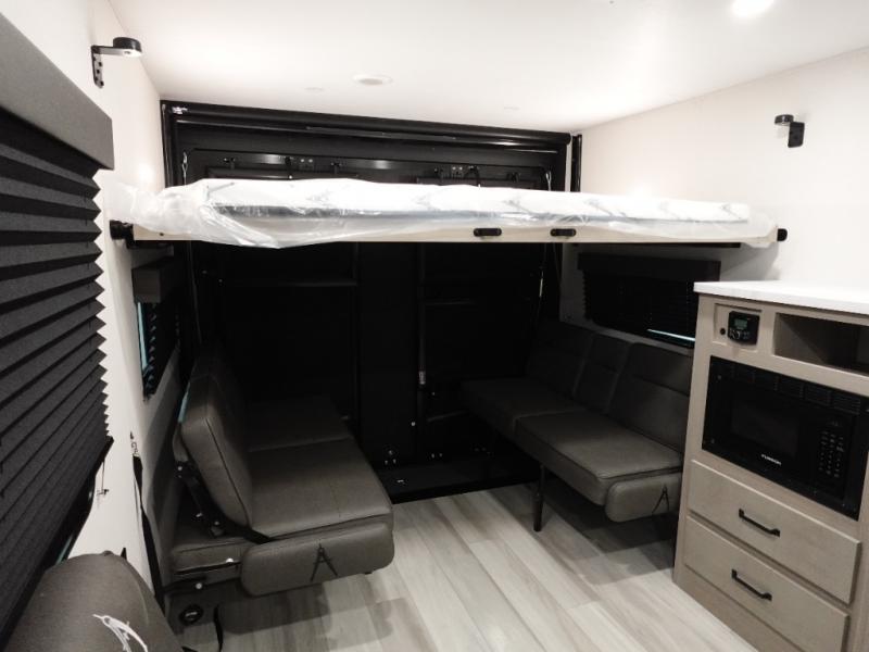 You will love this Momentum MAV toy hauler travel trailer! The front bedroom features a queen bed, and there is plenty of room to walk around. The sliding solid bedroom door helps with space. Overhead storage and a pair of nightstands are convenient storage, plus there is a wardrobe with both drawers and space to hang items. The kitchen offers a microwave, stainless steel sink, and an 8 cu. ft. 12V refrigerator. In the garage, you'll find rollover sofas with a table and a top bed for guests to sleep on. The ramp door/patio will provide additional living space once your toys are unloaded, and the pull down screen will keep bugs out!