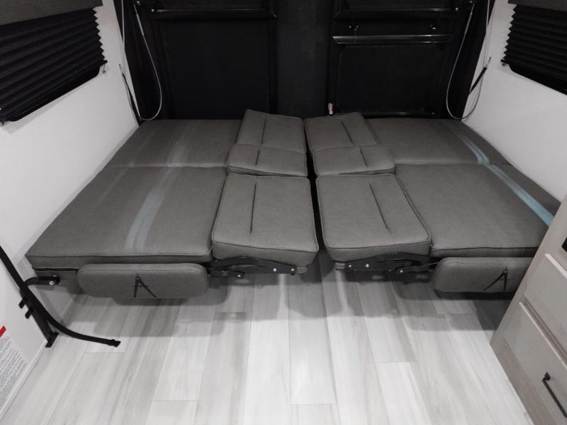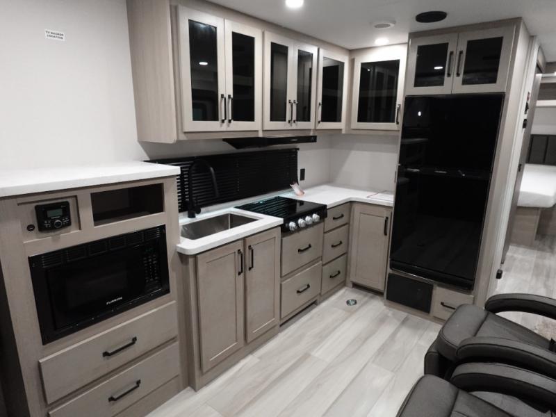 You will love this Momentum MAV toy hauler travel trailer! The front bedroom features a queen bed, and there is plenty of room to walk around. The sliding solid bedroom door helps with space. Overhead storage and a pair of nightstands are convenient storage, plus there is a wardrobe with both drawers and space to hang items. The kitchen offers a microwave, stainless steel sink, and an 8 cu. ft. 12V refrigerator. In the garage, you'll find rollover sofas with a table and a top bed for guests to sleep on. The ramp door/patio will provide additional living space once your toys are unloaded, and the pull down screen will keep bugs out!