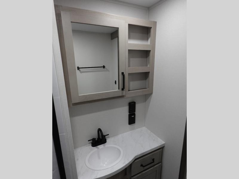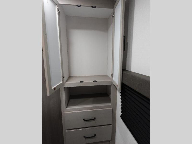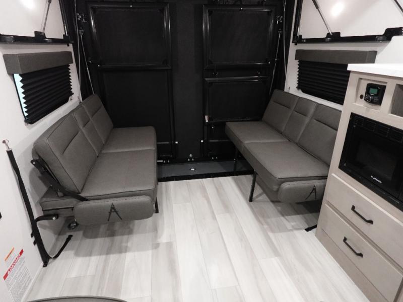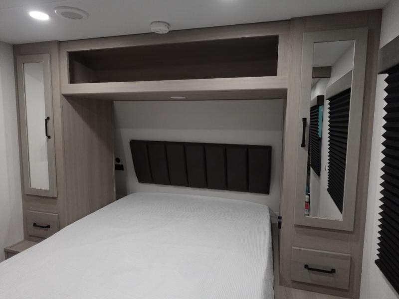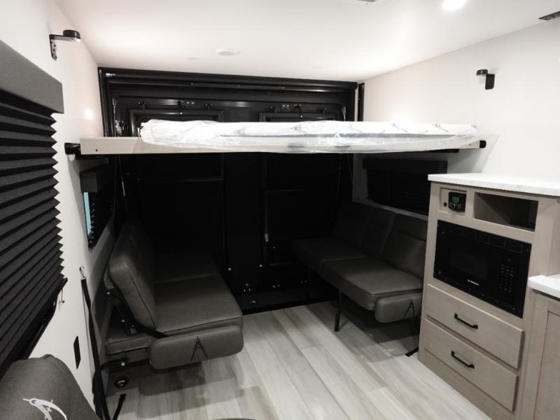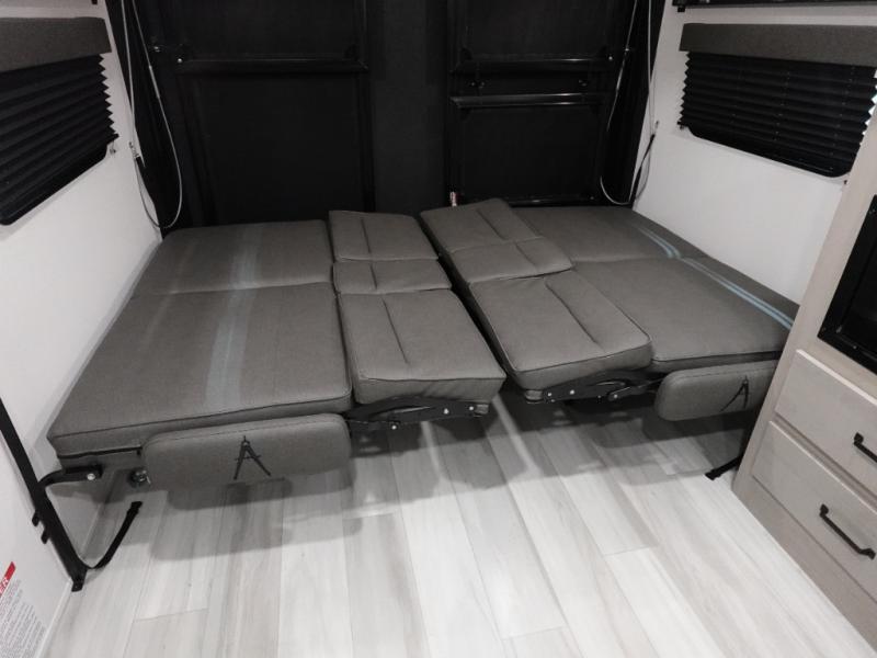 You will love this Momentum MAV toy hauler travel trailer! The front bedroom features a queen bed, and there is plenty of room to walk around. The sliding solid bedroom door helps with space. Overhead storage and a pair of nightstands are convenient storage, plus there is a wardrobe with both drawers and space to hang items. The kitchen offers a microwave, stainless steel sink, and an 8 cu. ft. 12V refrigerator. In the garage, you'll find rollover sofas with a table and a top bed for guests to sleep on. The ramp door/patio will provide additional living space once your toys are unloaded, and the pull down screen will keep bugs out!