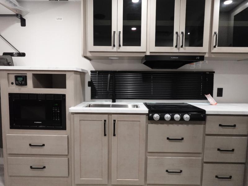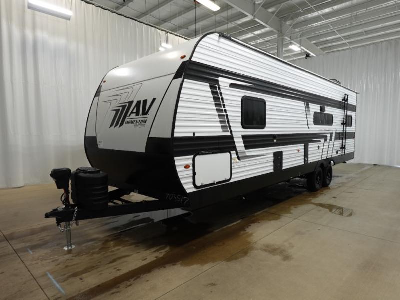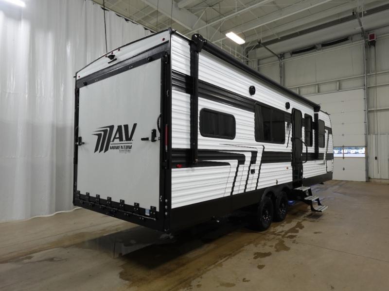 The Momentum MAV toy hauler travel trailers by Grand Design are designed to provide exactly what you need. The spacious garage provides tons of cargo space, with no wheel wells to get in the way. Additional storage includes magnetic storage door catches, and overhead consoles throughout. Conveniences like motion sensor lights and USB outlets will make your life easier, and you will be comfortable in all seasons with the 30K BTU furnace plus 15K BTU ducted air conditioning. The standard Solar Package comes with a 180W solar panel, a 40 Amp charge controller with Bluetooth, and a 12V refrigerator so you can go off-grid when the adventure calls for it.