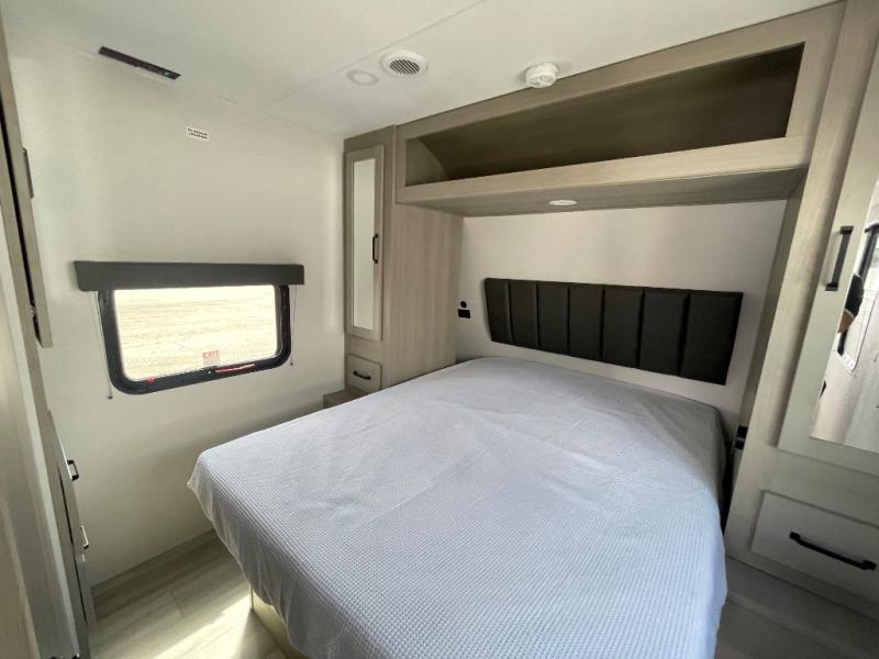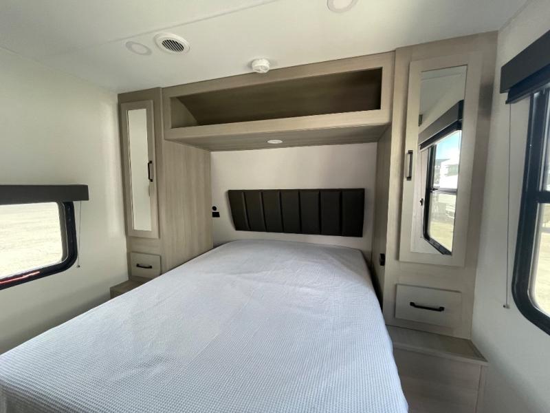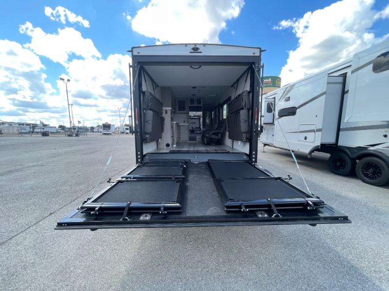 You will love this Momentum MAV toy hauler travel trailer! The front bedroom features a queen bed, and there is plenty of room to walk around. The sliding solid bedroom door helps with space. Overhead storage and a pair of nightstands are convenient storage, plus there is a wardrobe with both drawers and space to hang items. The kitchen offers a microwave, stainless steel sink, and an 8 cu. ft. 12V refrigerator. In the garage, you'll find rollover sofas with a table and a top bed for guests to sleep on. The ramp door/patio will provide additional living space once your toys are unloaded, and the pull down screen will keep bugs out!