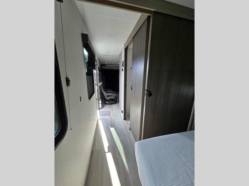 You will love this Momentum MAV toy hauler travel trailer! The front bedroom features a queen bed, and there is plenty of room to walk around. The sliding solid bedroom door helps with space. Overhead storage and a pair of nightstands are convenient storage, plus there is a wardrobe with both drawers and space to hang items. The kitchen offers a microwave, stainless steel sink, and an 8 cu. ft. 12V refrigerator. In the garage, you'll find rollover sofas with a table and a top bed for guests to sleep on. The ramp door/patio will provide additional living space once your toys are unloaded, and the pull down screen will keep bugs out!