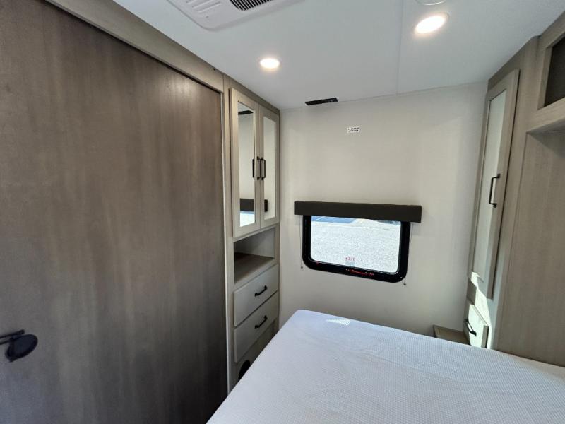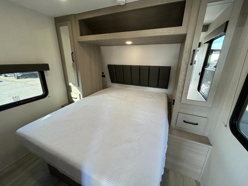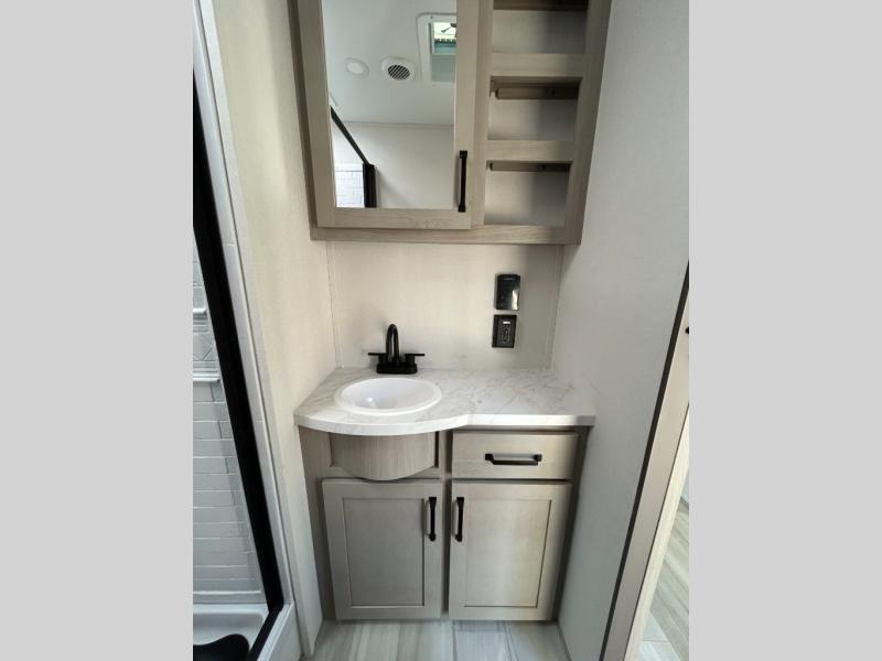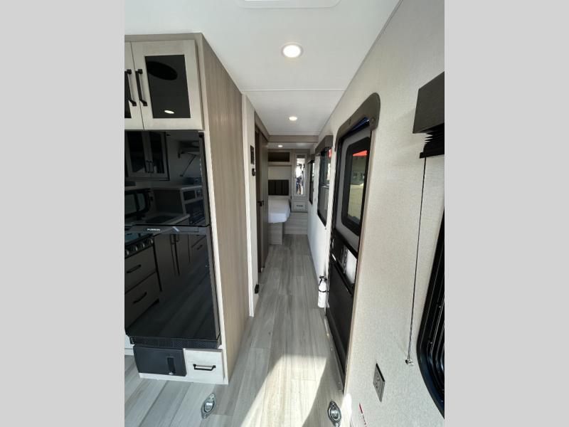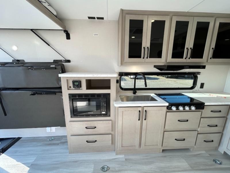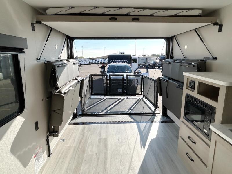 You will love this Momentum MAV toy hauler travel trailer! The front bedroom features a queen bed, and there is plenty of room to walk around. The sliding solid bedroom door helps with space. Overhead storage and a pair of nightstands are convenient storage, plus there is a wardrobe with both drawers and space to hang items. The kitchen offers a microwave, stainless steel sink, and an 8 cu. ft. 12V refrigerator. In the garage, you'll find rollover sofas with a table and a top bed for guests to sleep on. The ramp door/patio will provide additional living space once your toys are unloaded, and the pull down screen will keep bugs out!