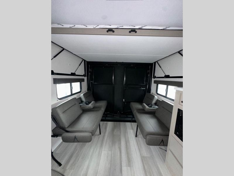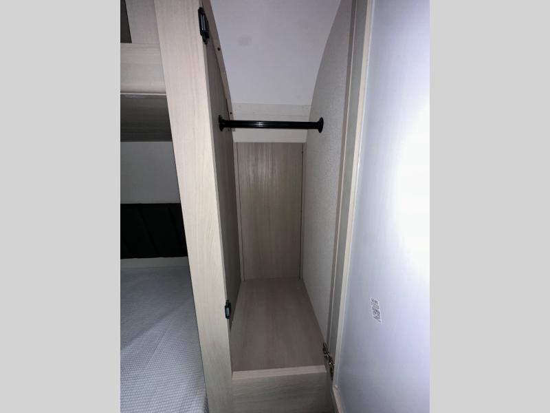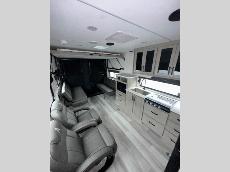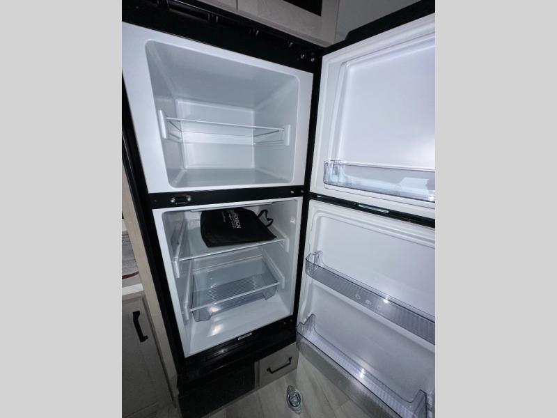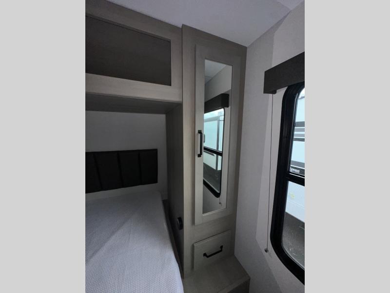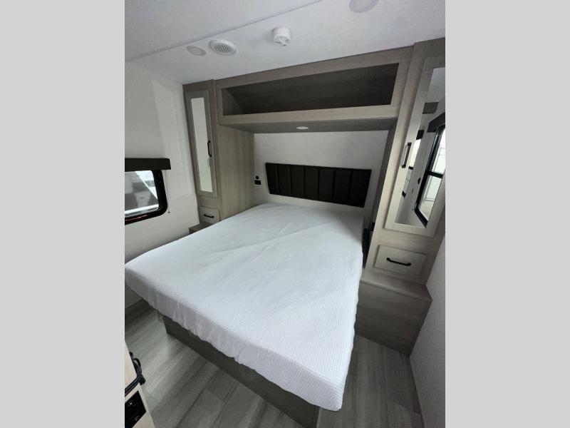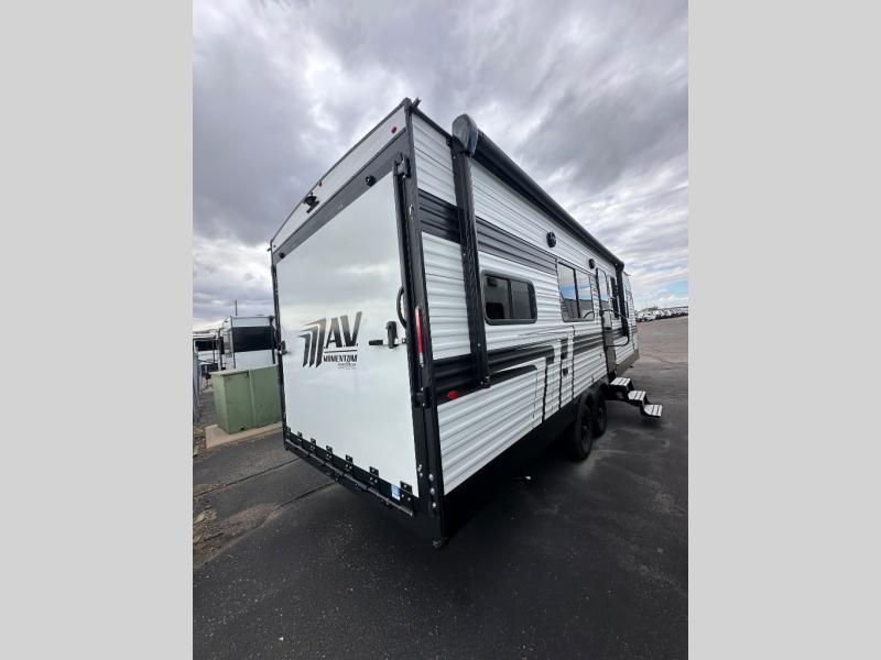 You will love this Momentum MAV toy hauler travel trailer! The front bedroom features a queen bed, and there is plenty of room to walk around. The sliding solid bedroom door helps with space. Overhead storage and a pair of nightstands are convenient storage, plus there is a wardrobe with both drawers and space to hang items. The kitchen offers a microwave, stainless steel sink, and an 8 cu. ft. 12V refrigerator. In the garage, you'll find rollover sofas with a table and a top bed for guests to sleep on. The ramp door/patio will provide additional living space once your toys are unloaded, and the pull down screen will keep bugs out!