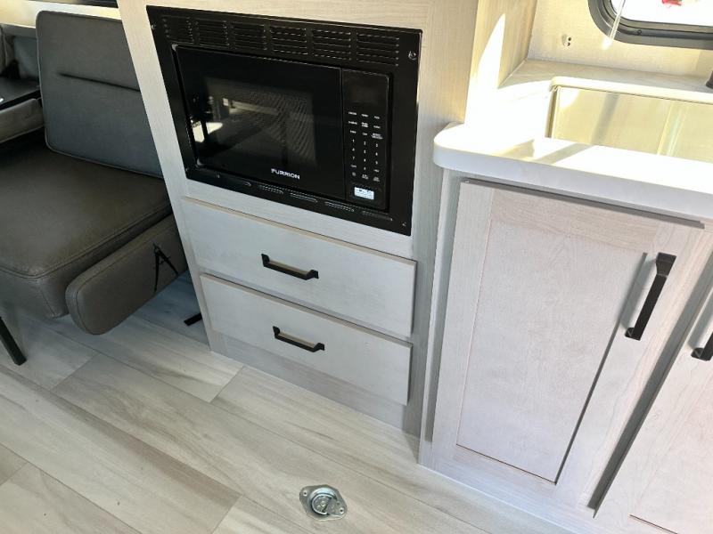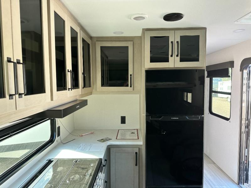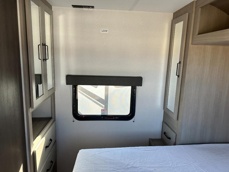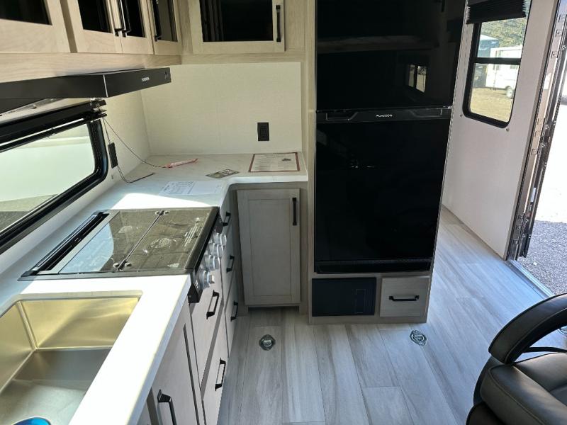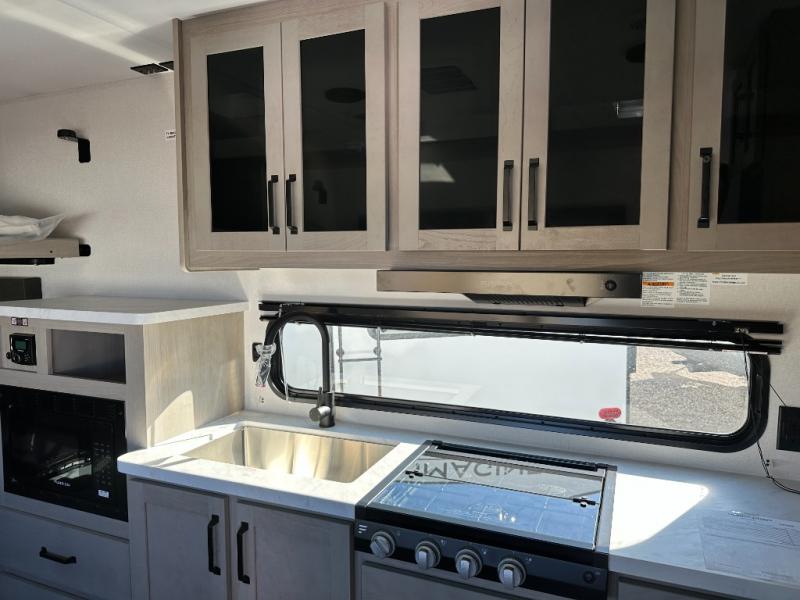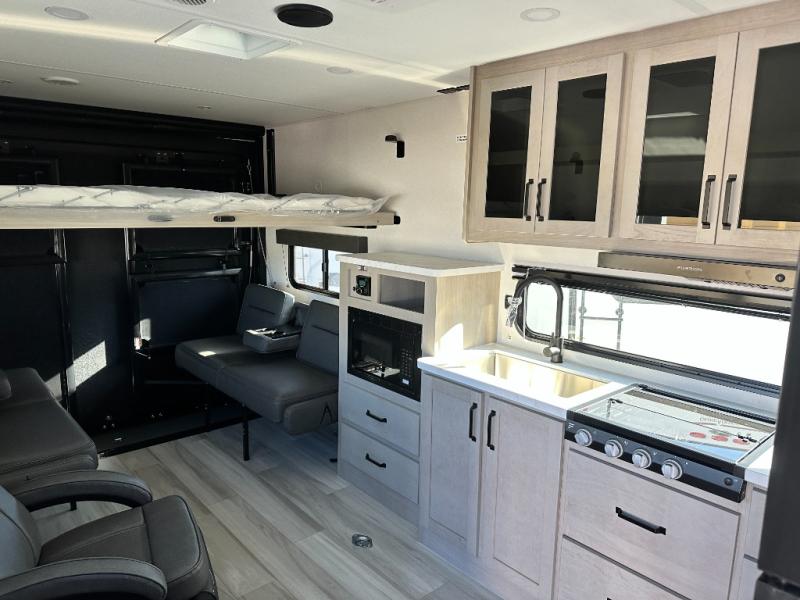 You will love this Momentum MAV toy hauler travel trailer! The front bedroom features a queen bed, and there is plenty of room to walk around. The sliding solid bedroom door helps with space. Overhead storage and a pair of nightstands are convenient storage, plus there is a wardrobe with both drawers and space to hang items. The kitchen offers a microwave, stainless steel sink, and an 8 cu. ft. 12V refrigerator. In the garage, you'll find rollover sofas with a table and a top bed for guests to sleep on. The ramp door/patio will provide additional living space once your toys are unloaded, and the pull down screen will keep bugs out!