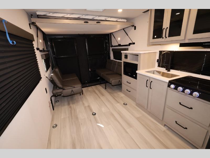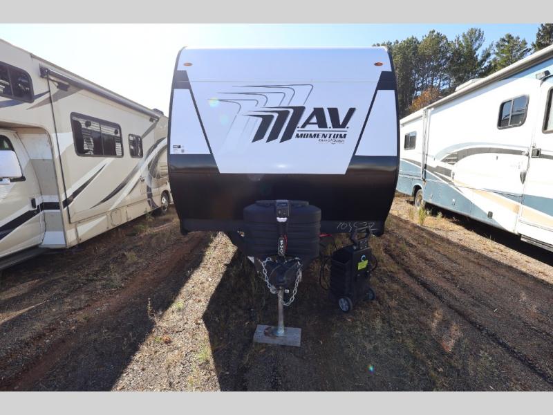 You will love this Momentum MAV toy hauler travel trailer! The front bedroom features a queen bed, and there is plenty of room to walk around. The sliding solid bedroom door helps with space. Overhead storage and a pair of nightstands are convenient storage, plus there is a wardrobe with both drawers and space to hang items. The kitchen offers a microwave, stainless steel sink, and an 8 cu. ft. 12V refrigerator. In the garage, you'll find rollover sofas with a table and a top bed for guests to sleep on. The ramp door/patio will provide additional living space once your toys are unloaded, and the pull down screen will keep bugs out!