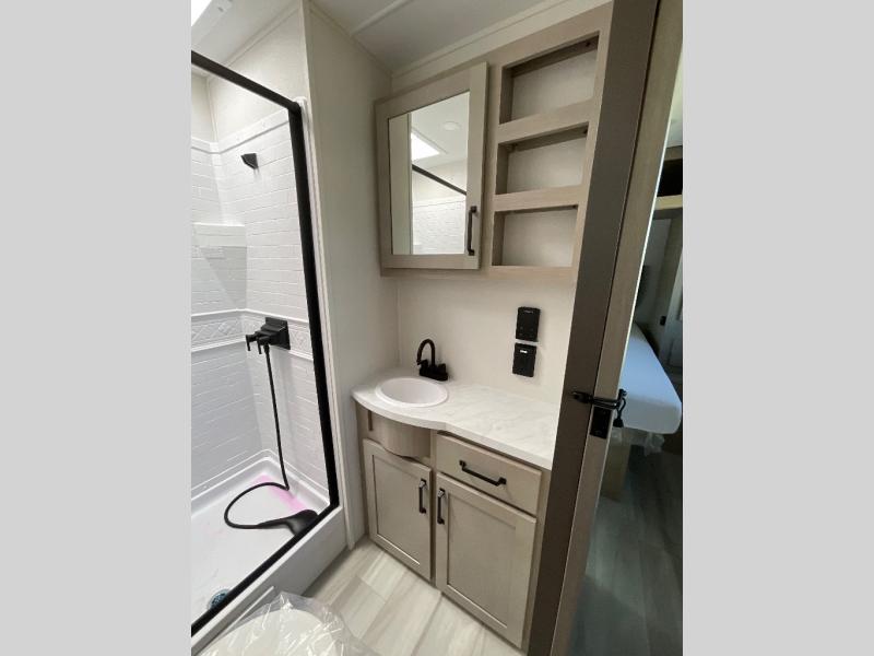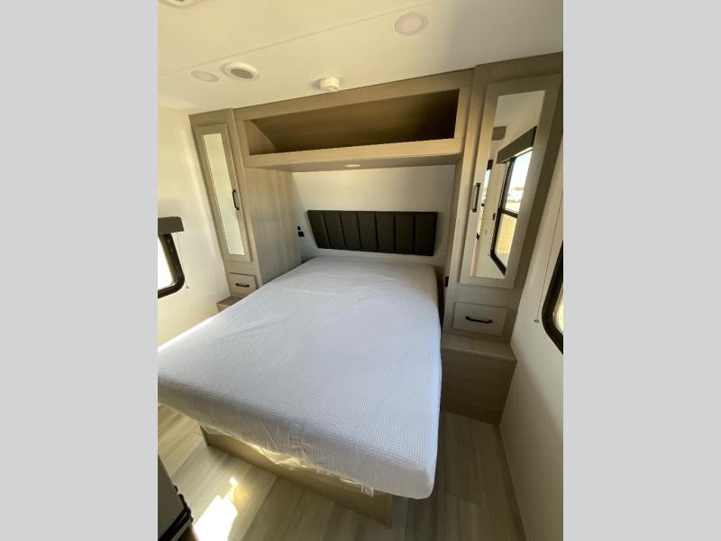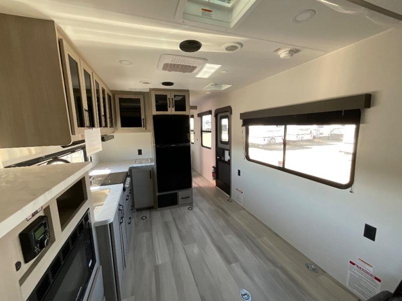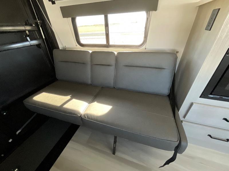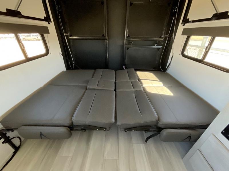 You will love this Momentum MAV toy hauler travel trailer! The front bedroom features a queen bed, and there is plenty of room to walk around. The sliding solid bedroom door helps with space. Overhead storage and a pair of nightstands are convenient storage, plus there is a wardrobe with both drawers and space to hang items. The kitchen offers a microwave, stainless steel sink, and an 8 cu. ft. 12V refrigerator. In the garage, you'll find rollover sofas with a table and a top bed for guests to sleep on. The ramp door/patio will provide additional living space once your toys are unloaded, and the pull down screen will keep bugs out!