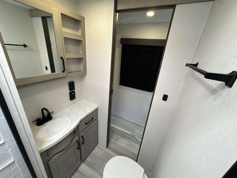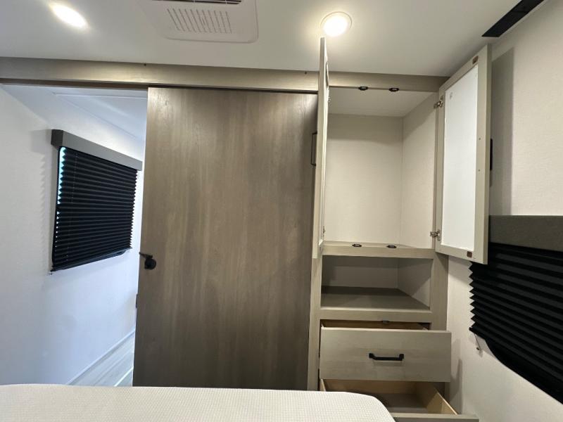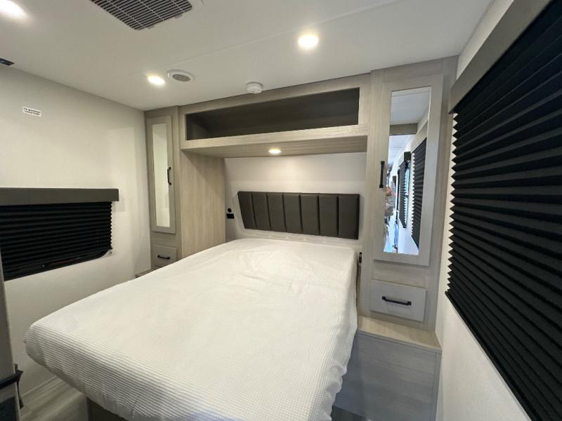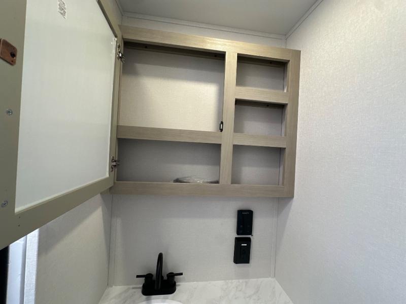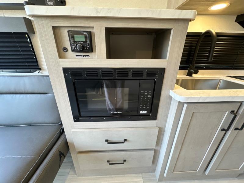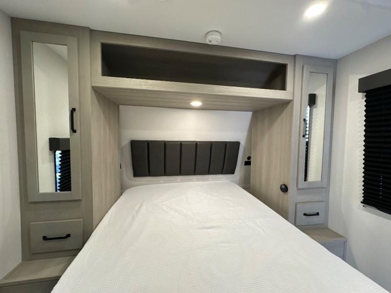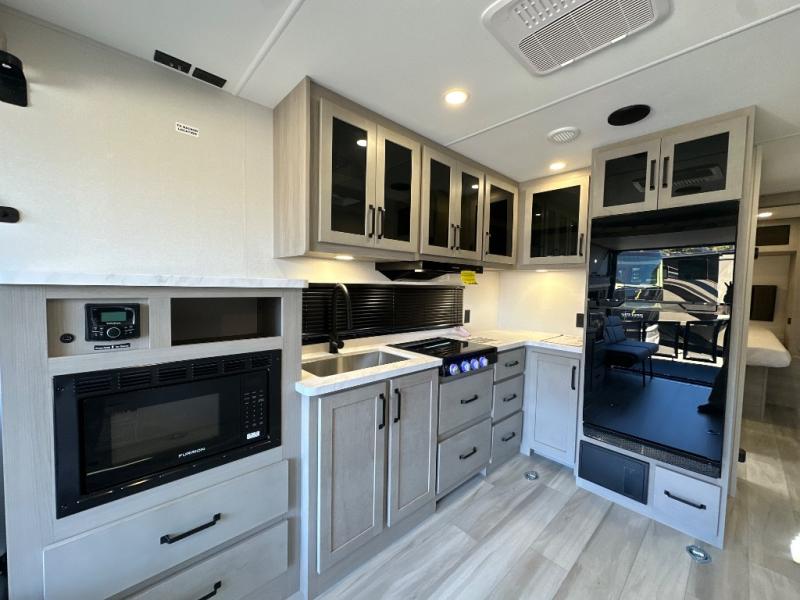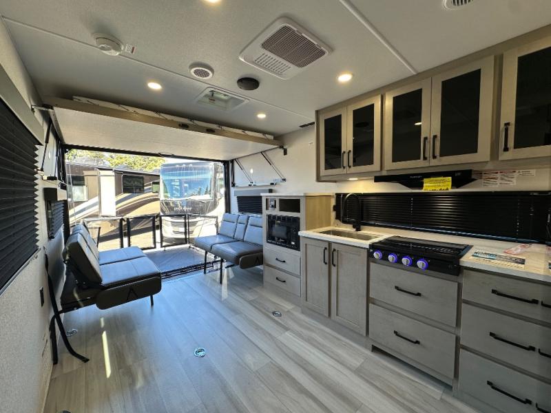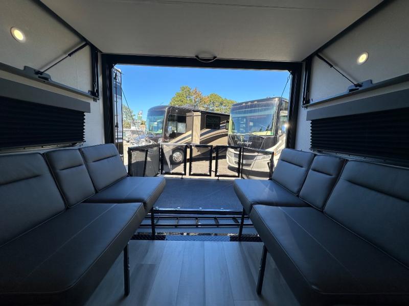 You will love this Momentum MAV toy hauler travel trailer! The front bedroom features a queen bed, and there is plenty of room to walk around. The sliding solid bedroom door helps with space. Overhead storage and a pair of nightstands are convenient storage, plus there is a wardrobe with both drawers and space to hang items. The kitchen offers a microwave, stainless steel sink, and an 8 cu. ft. 12V refrigerator. In the garage, you'll find rollover sofas with a table and a top bed for guests to sleep on. The ramp door/patio will provide additional living space once your toys are unloaded, and the pull down screen will keep bugs out!