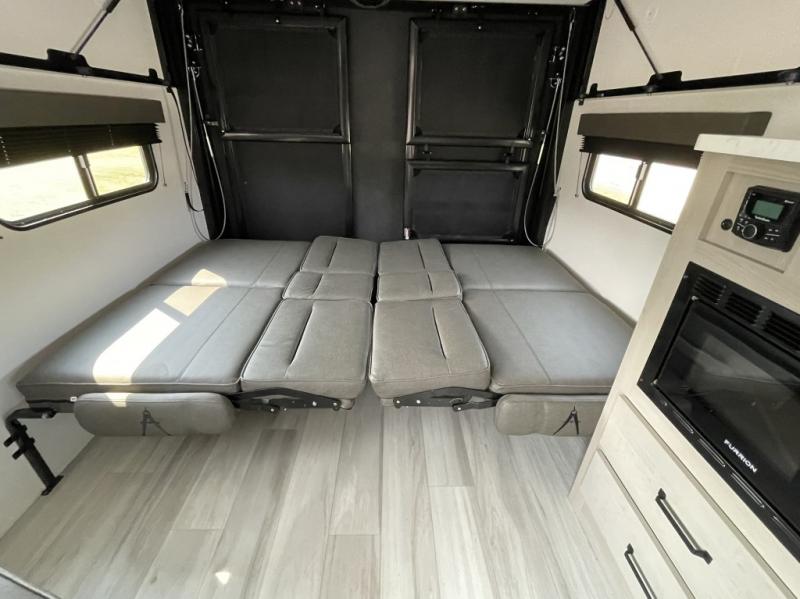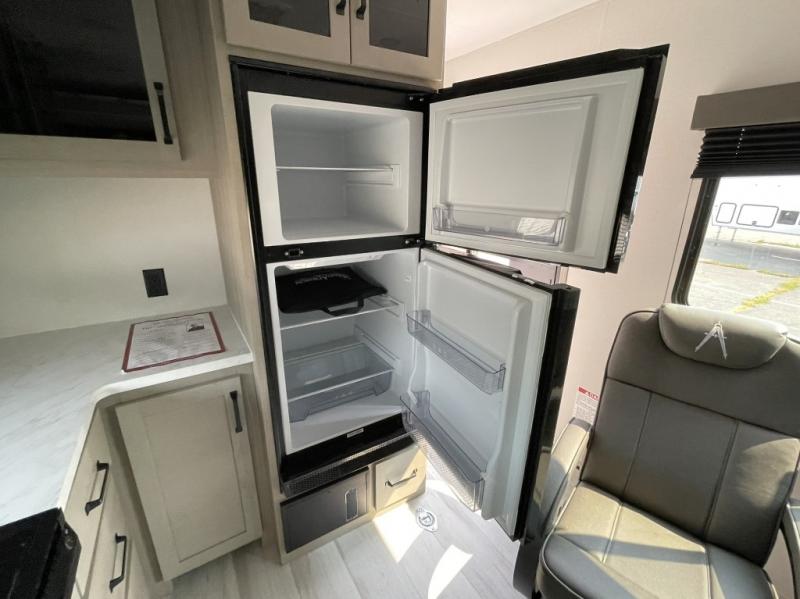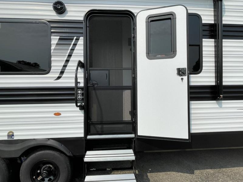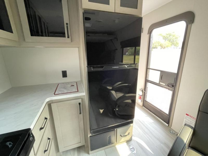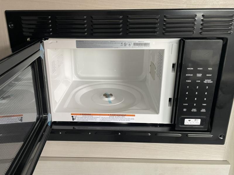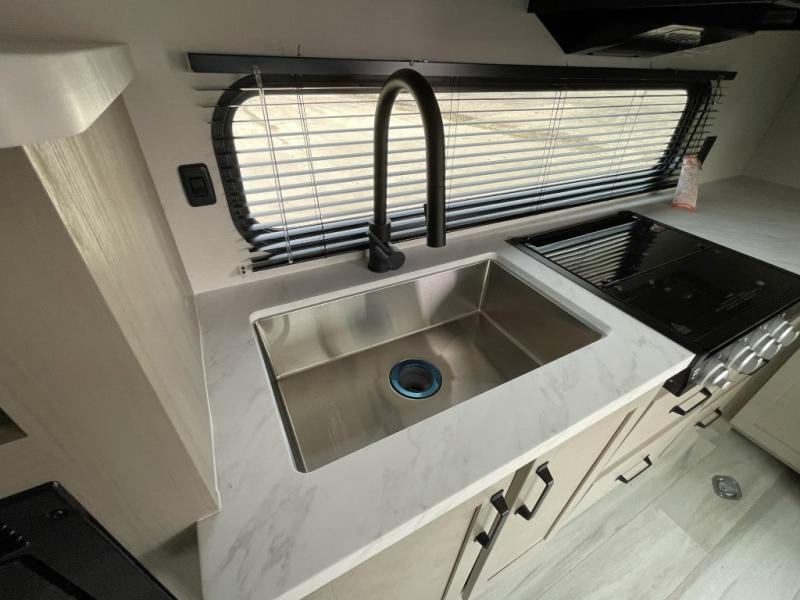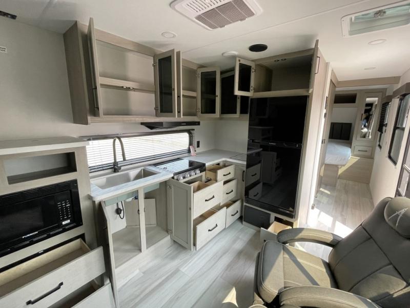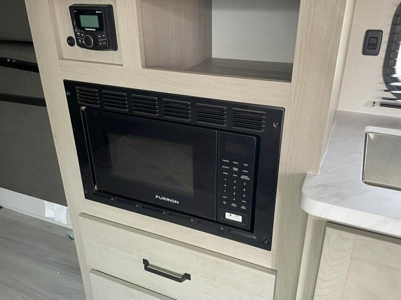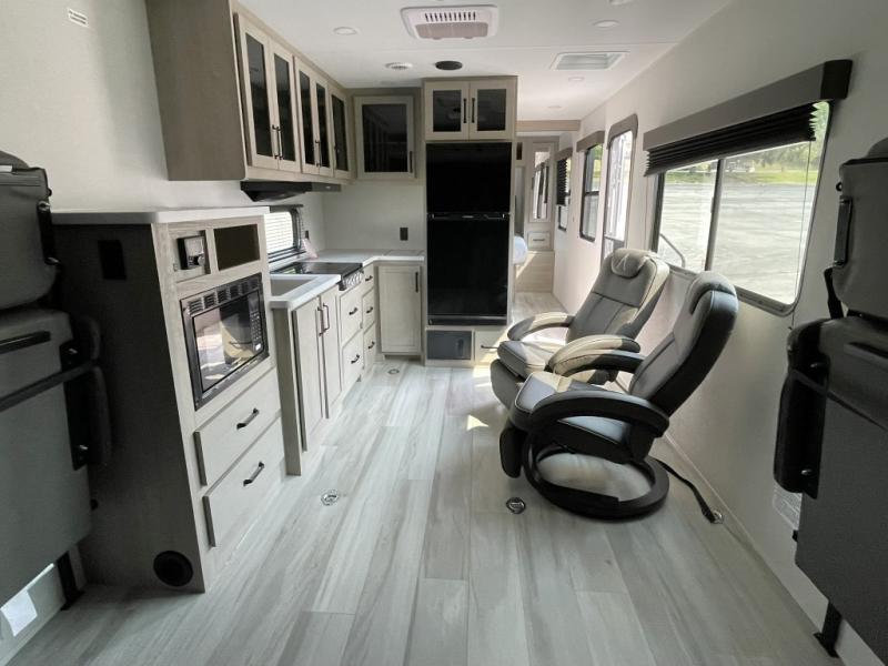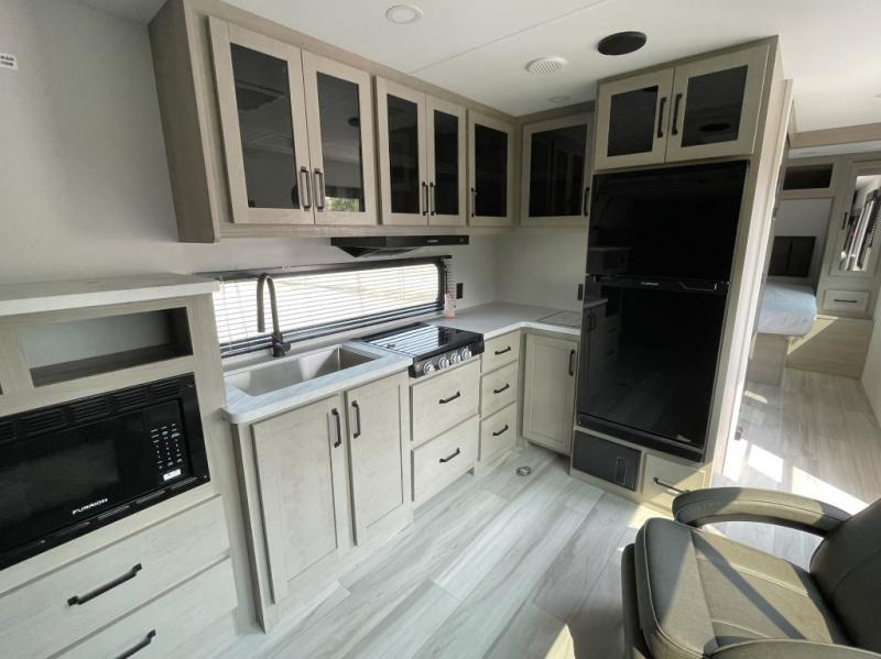 Spacious Kitchen – Whip up meals with a 3-burner cooktop, microwave, 8 cu. ft. 12V refrigerator, and stainless steel sink.