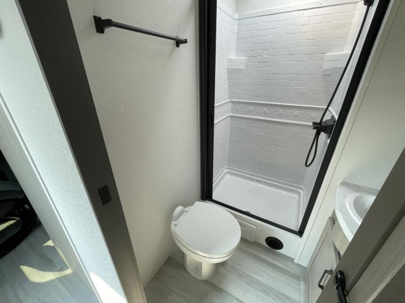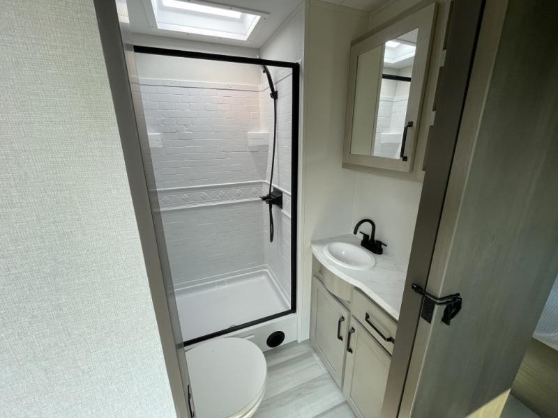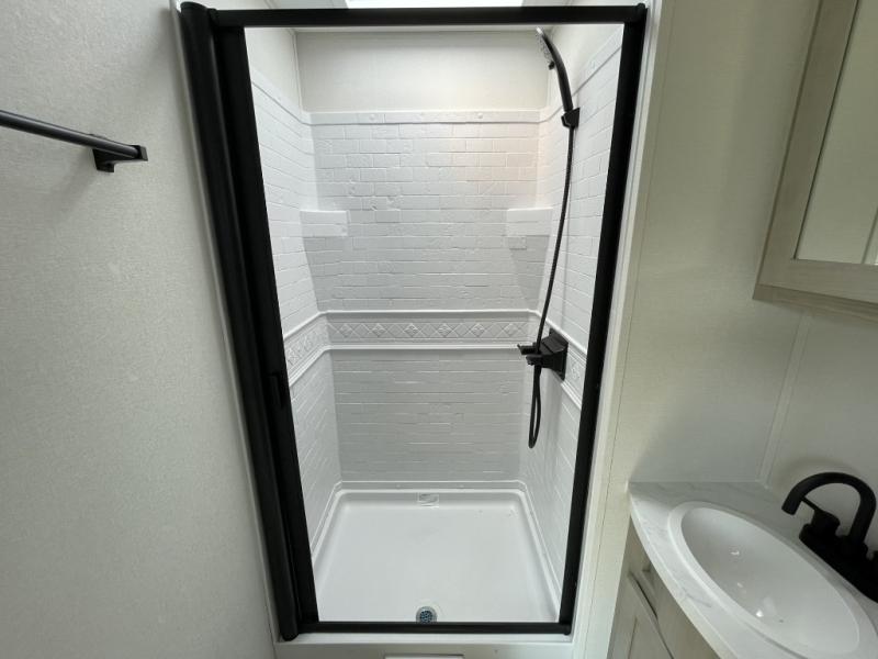 Full Bath – Walk-in shower, vanity, toilet, and storage for a true home-on-the-road feel.