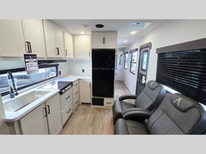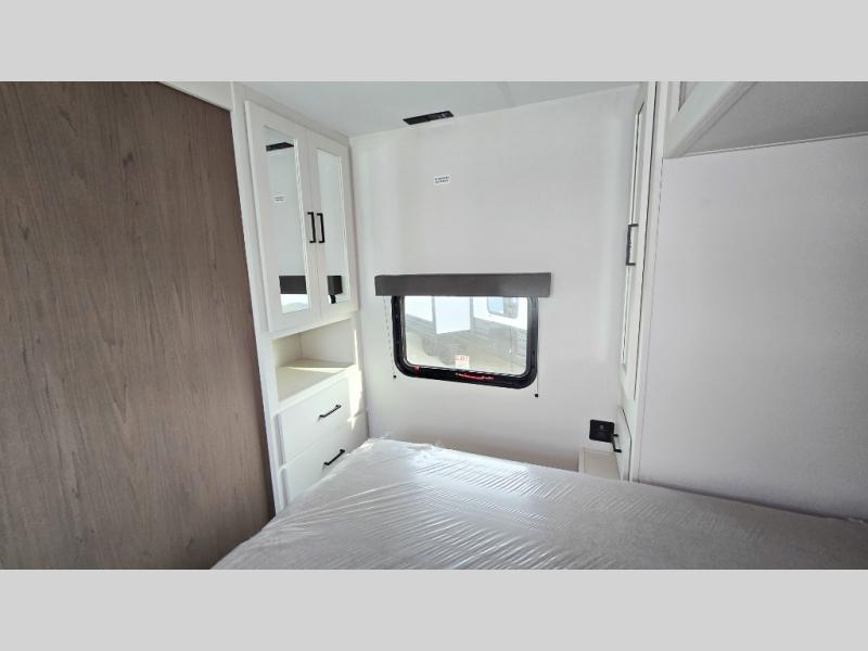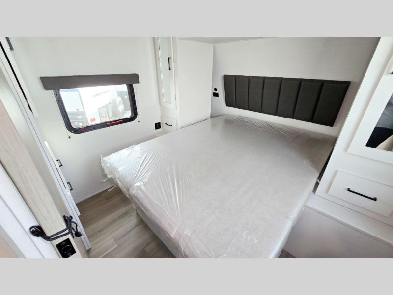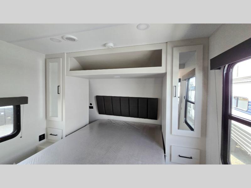 You will love this Momentum MAV toy hauler travel trailer! The front bedroom features a queen bed, and there is plenty of room to walk around. The sliding solid bedroom door helps with space. Overhead storage and a pair of nightstands are convenient storage, plus there is a wardrobe with both drawers and space to hang items. The kitchen offers a microwave, stainless steel sink, and an 8 cu. ft. 12V refrigerator. In the garage, you'll find rollover sofas with a table and a top bed for guests to sleep on. The ramp door/patio will provide additional living space once your toys are unloaded, and the pull down screen will keep bugs out!