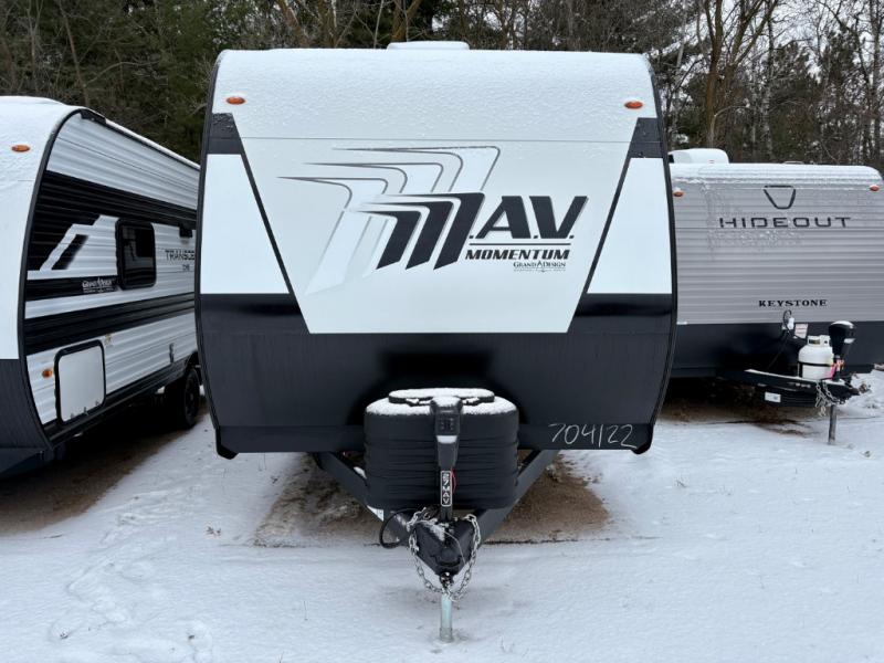 The Momentum MAV toy hauler travel trailers by Grand Design are designed to provide exactly what you need. The spacious garage provides tons of cargo space, with no wheel wells to get in the way. Additional storage includes magnetic storage door catches, and overhead consoles throughout. Conveniences like motion sensor lights and USB outlets will make your life easier, and you will be comfortable in all seasons with the 30K BTU furnace plus 15K BTU ducted air conditioning. The standard Solar Package comes with a 180W solar panel, a 40 Amp charge controller with Bluetooth, and a 12V refrigerator so you can go off-grid when the adventure calls for it.