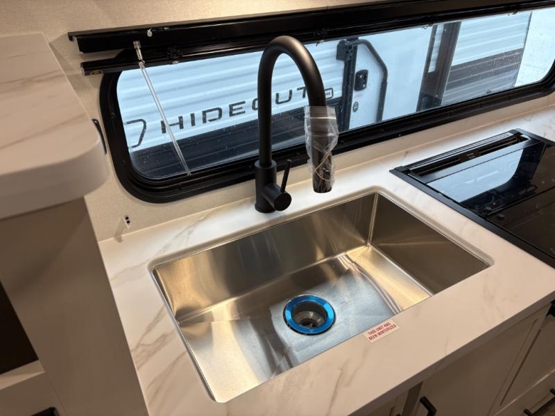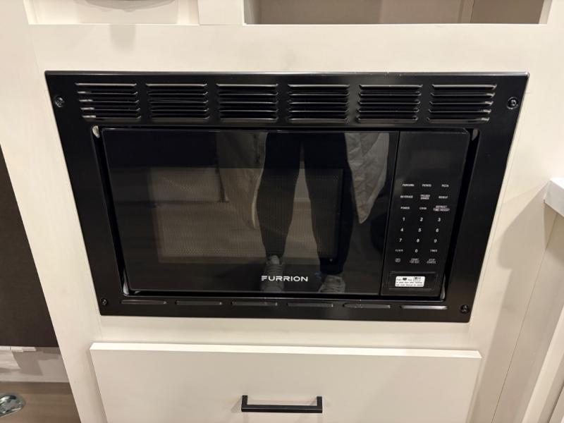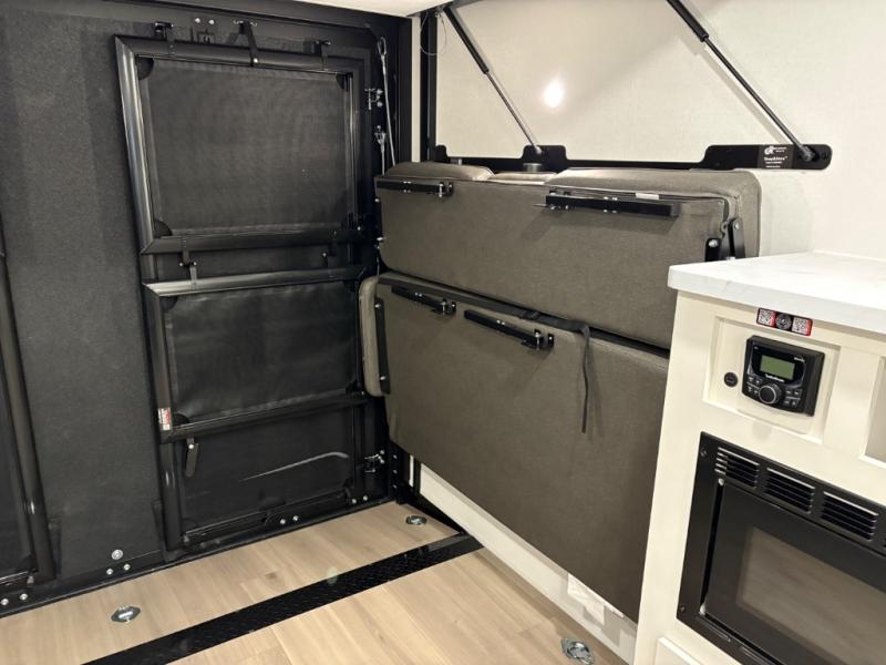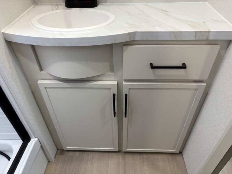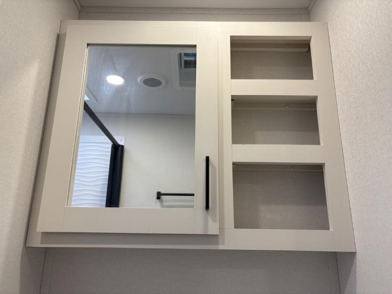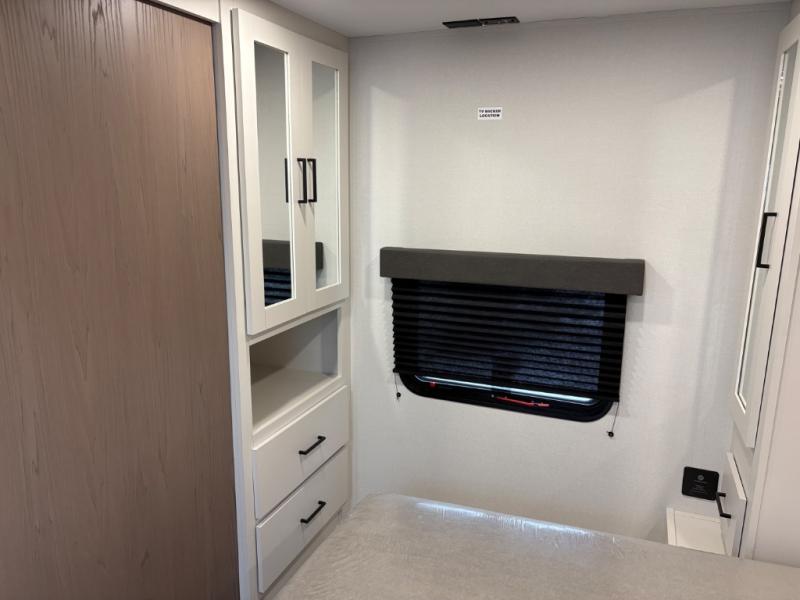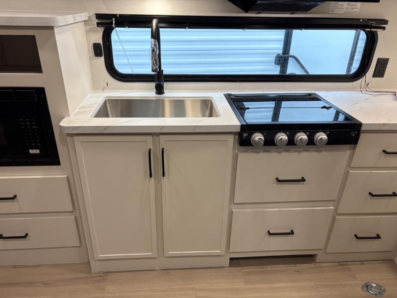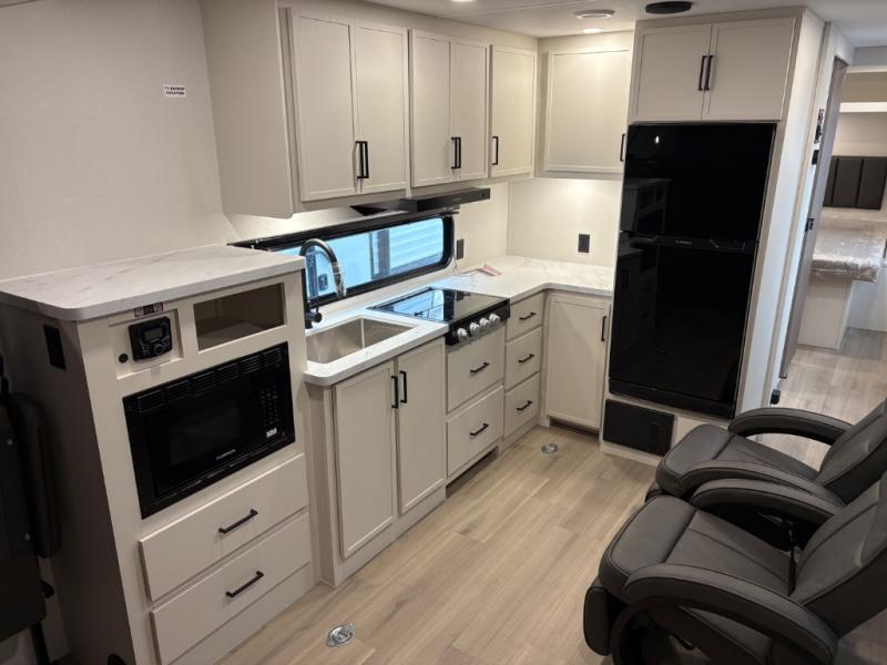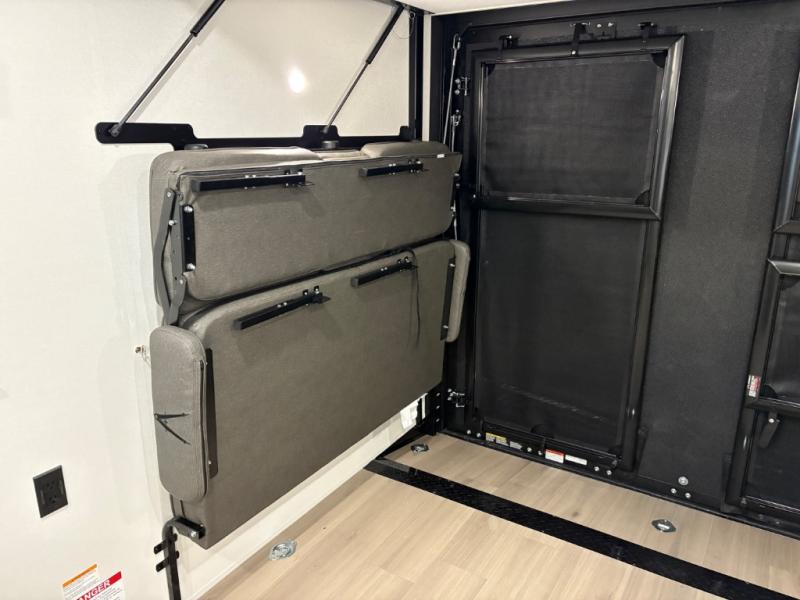 You will love this Momentum MAV toy hauler travel trailer! The front bedroom features a queen bed, and there is plenty of room to walk around. The sliding solid bedroom door helps with space. Overhead storage and a pair of nightstands are convenient storage, plus there is a wardrobe with both drawers and space to hang items. The kitchen offers a microwave, stainless steel sink, and an 8 cu. ft. 12V refrigerator. In the garage, you'll find rollover sofas with a table and a top bed for guests to sleep on. The ramp door/patio will provide additional living space once your toys are unloaded, and the pull down screen will keep bugs out!