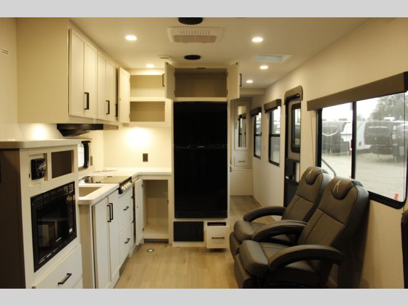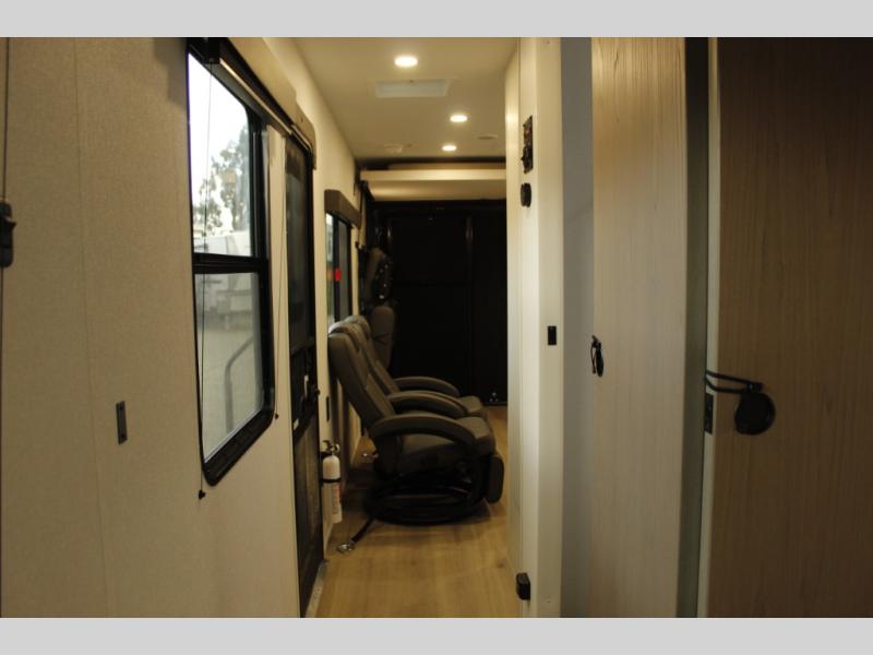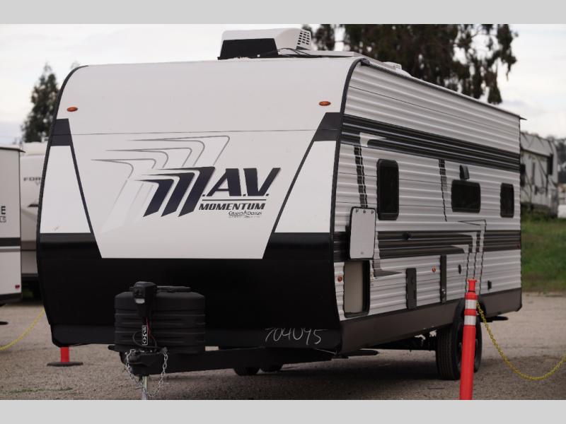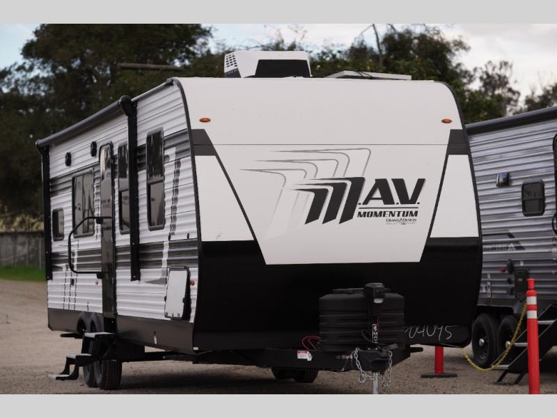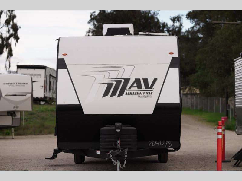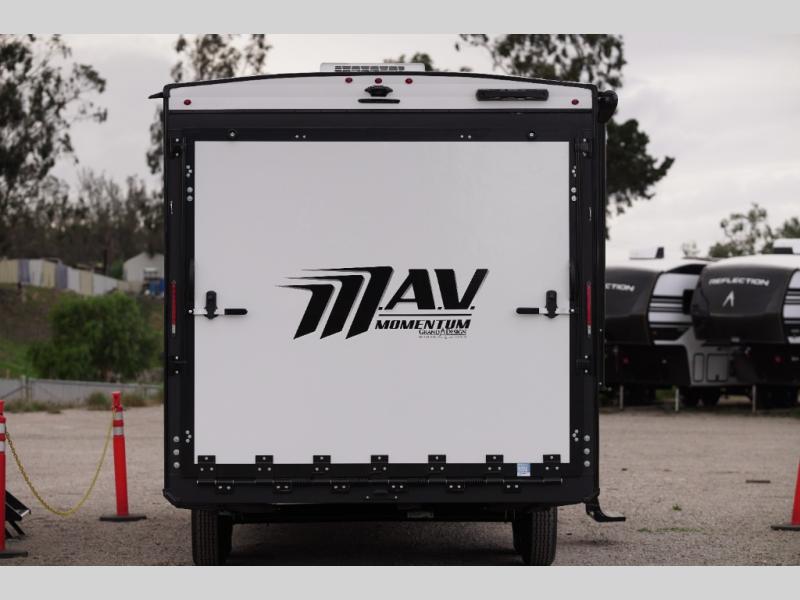 The Momentum MAV toy hauler travel trailers by Grand Design are designed to provide exactly what you need. The spacious garage provides tons of cargo space, with no wheel wells to get in the way. Additional storage includes magnetic storage door catches, and overhead consoles throughout. Conveniences like motion sensor lights and USB outlets will make your life easier, and you will be comfortable in all seasons with the 30K BTU furnace plus 15K BTU ducted air conditioning. The standard Solar Package comes with a 180W solar panel, a 40 Amp charge controller with Bluetooth, and a 12V refrigerator so you can go off-grid when the adventure calls for it.