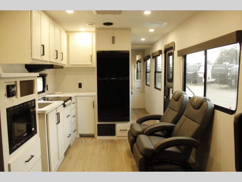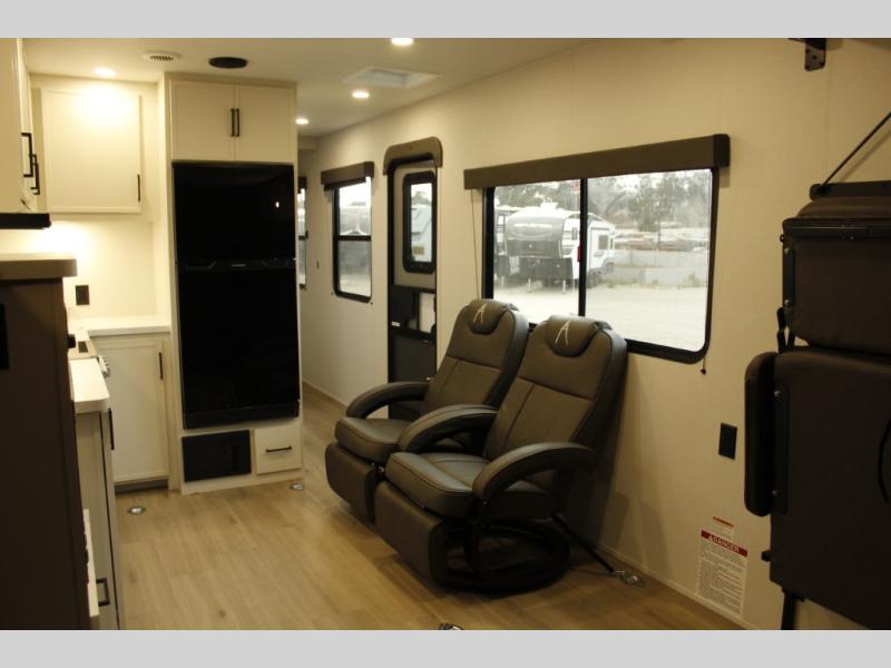 You will love this Momentum MAV toy hauler travel trailer! The front bedroom features a queen bed, and there is plenty of room to walk around. The sliding solid bedroom door helps with space. Overhead storage and a pair of nightstands are convenient storage, plus there is a wardrobe with both drawers and space to hang items. The kitchen offers a microwave, stainless steel sink, and an 8 cu. ft. 12V refrigerator. In the garage, you'll find rollover sofas with a table and a top bed for guests to sleep on. The ramp door/patio will provide additional living space once your toys are unloaded, and the pull down screen will keep bugs out!