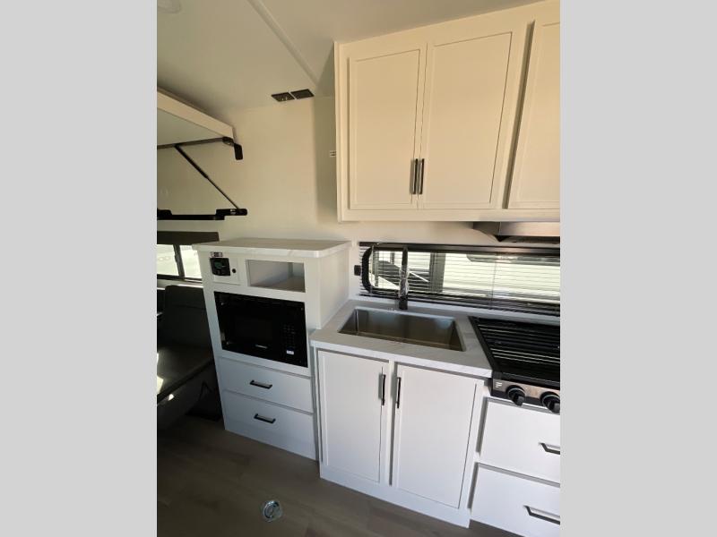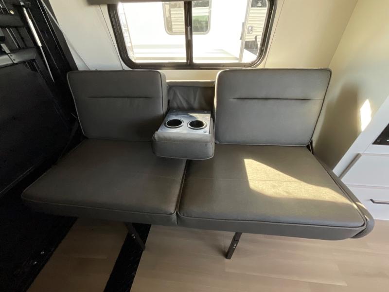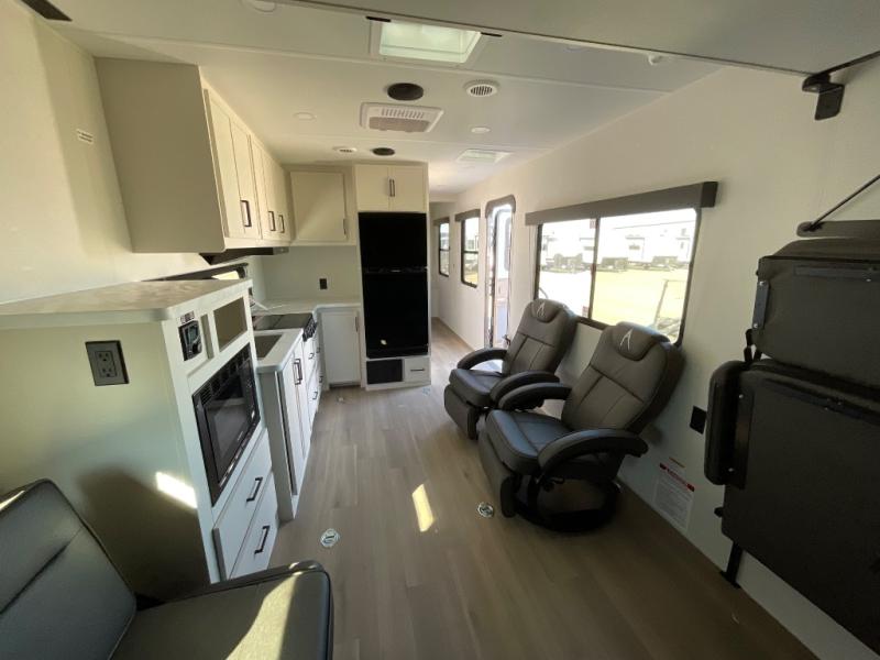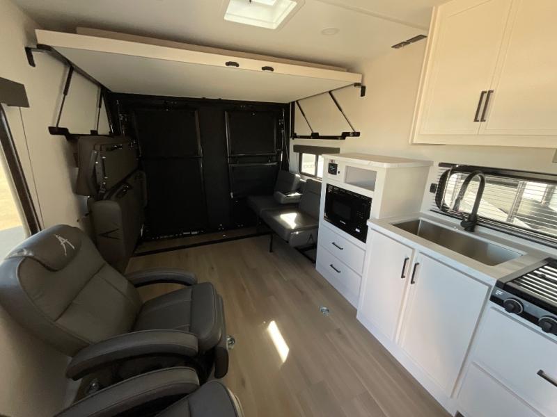 You will love this Momentum MAV toy hauler travel trailer! The front bedroom features a queen bed, and there is plenty of room to walk around. The sliding solid bedroom door helps with space. Overhead storage and a pair of nightstands are convenient storage, plus there is a wardrobe with both drawers and space to hang items. The kitchen offers a microwave, stainless steel sink, and an 8 cu. ft. 12V refrigerator. In the garage, you'll find rollover sofas with a table and a top bed for guests to sleep on. The ramp door/patio will provide additional living space once your toys are unloaded, and the pull down screen will keep bugs out!