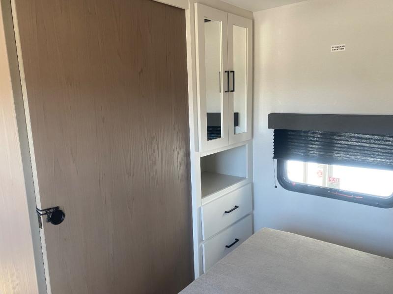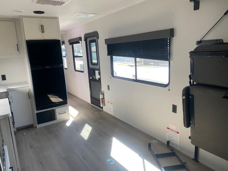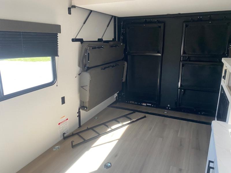 You will love this Momentum MAV toy hauler travel trailer! The front bedroom features a queen bed, and there is plenty of room to walk around. The sliding solid bedroom door helps with space. Overhead storage and a pair of nightstands are convenient storage, plus there is a wardrobe with both drawers and space to hang items. The kitchen offers a microwave, stainless steel sink, and an 8 cu. ft. 12V refrigerator. In the garage, you'll find rollover sofas with a table and a top bed for guests to sleep on. The ramp door/patio will provide additional living space once your toys are unloaded, and the pull down screen will keep bugs out!