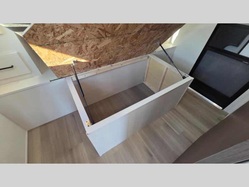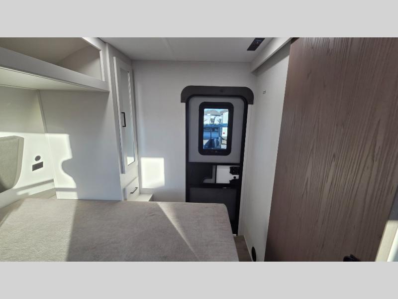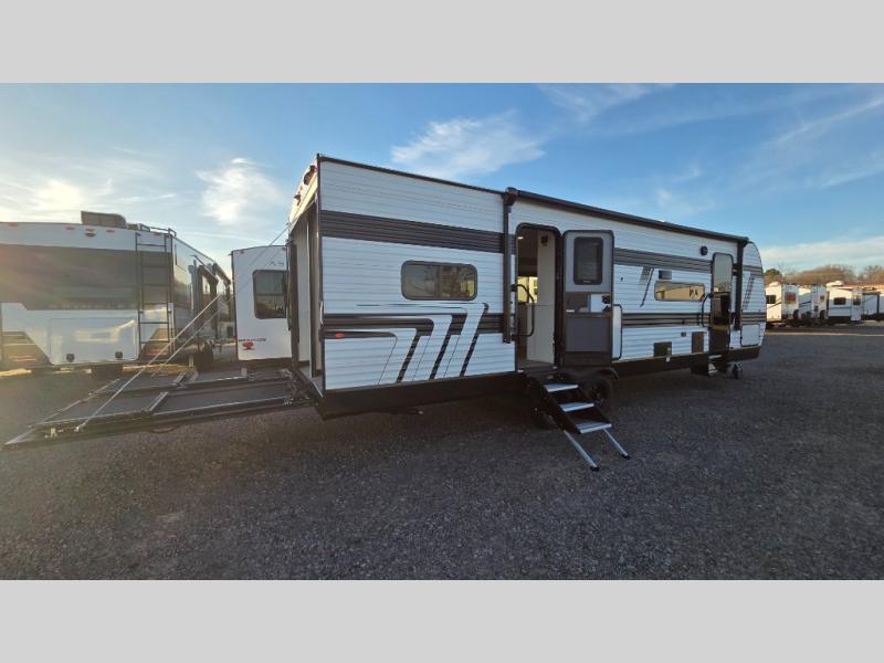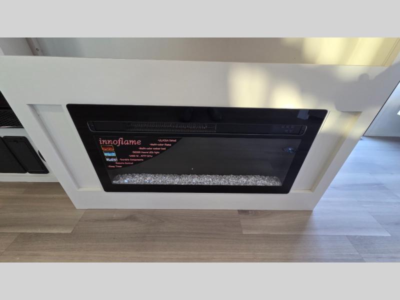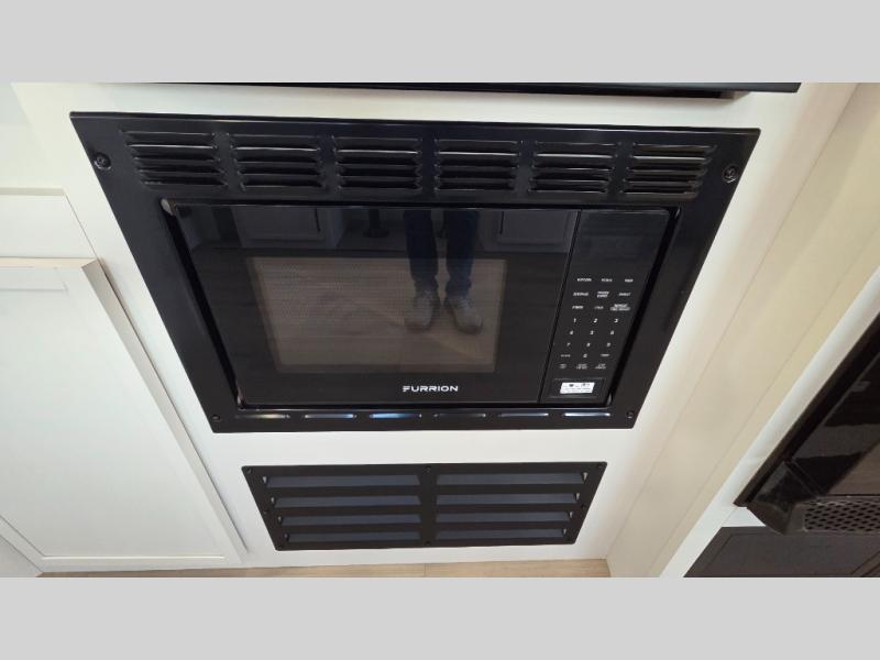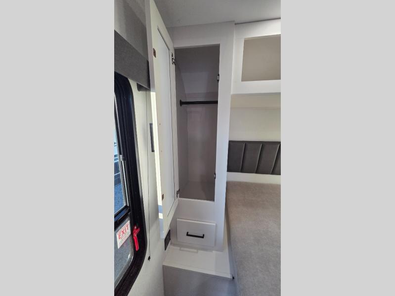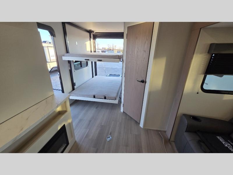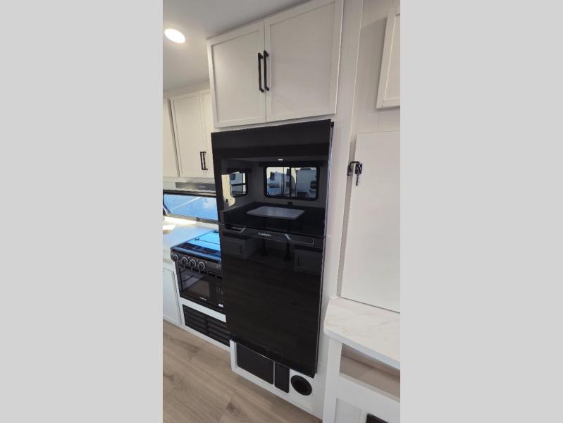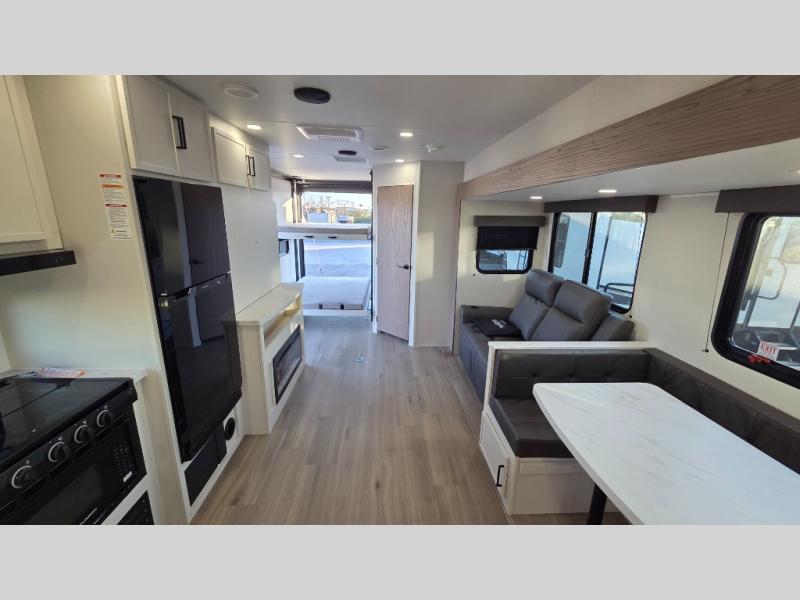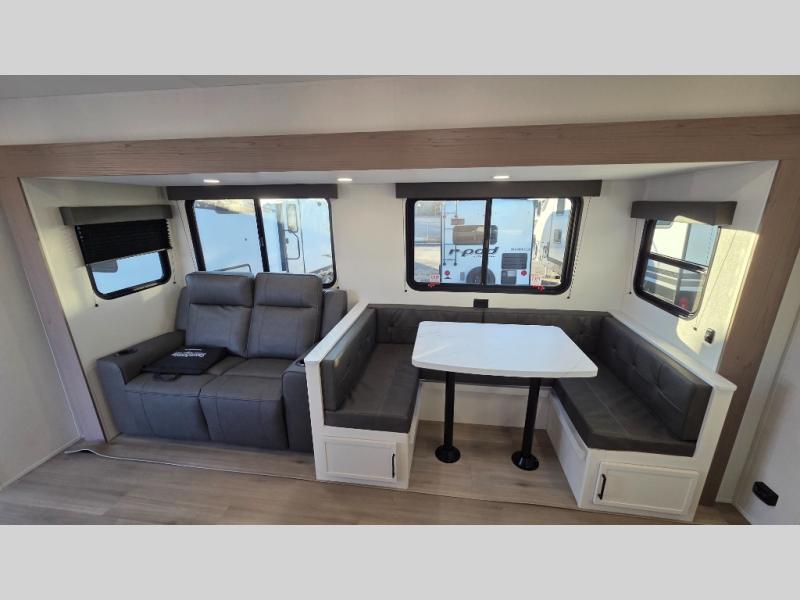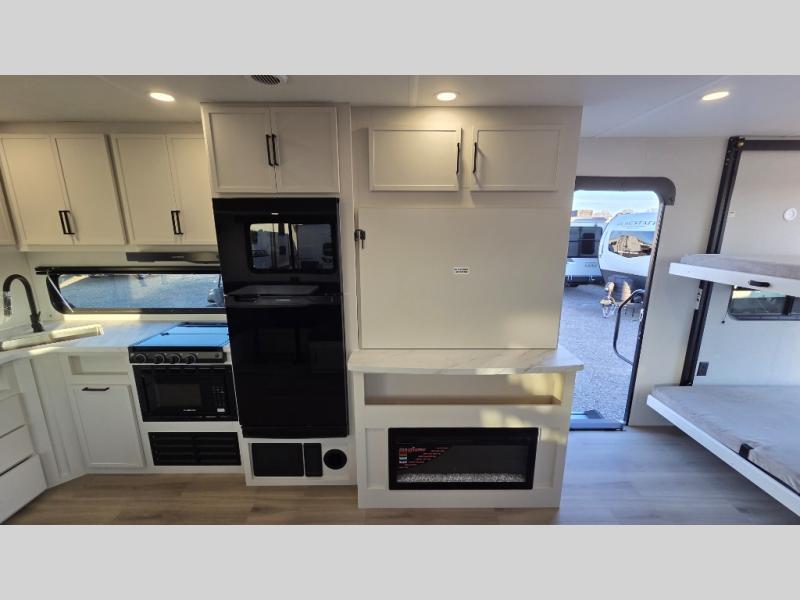 The spacious garage area is perfect for hauling your favorite toys, and the two entry/exit doors make it easy to get in and out. The front bedroom is a peaceful retreat, featuring a queen bed, wardrobes, and plenty of storage for your gear. Further in the heart of this unit, the U-shaped dinette is perfect for enjoying meals or game nights, and the pull-out trash makes cleanup a breeze. The kitchen is equipped with a microwave and 8 cu refrigerator, so you can fuel up for your next adventure. The theater seating is perfect for movie nights or catching up on your favorite shows, and the electric Happijac bunks provide a comfortable spot to rest. The full bathroom is a refreshing oasis, equipped with everything you need to start your day feeling revitalized.