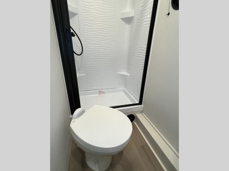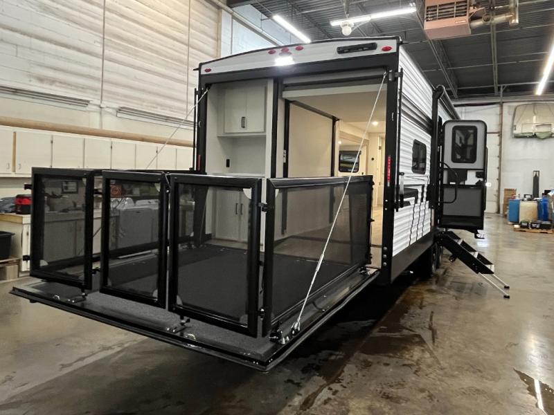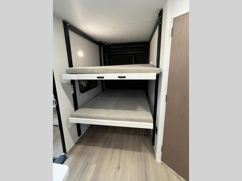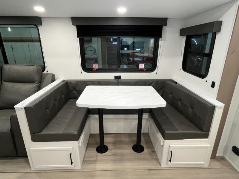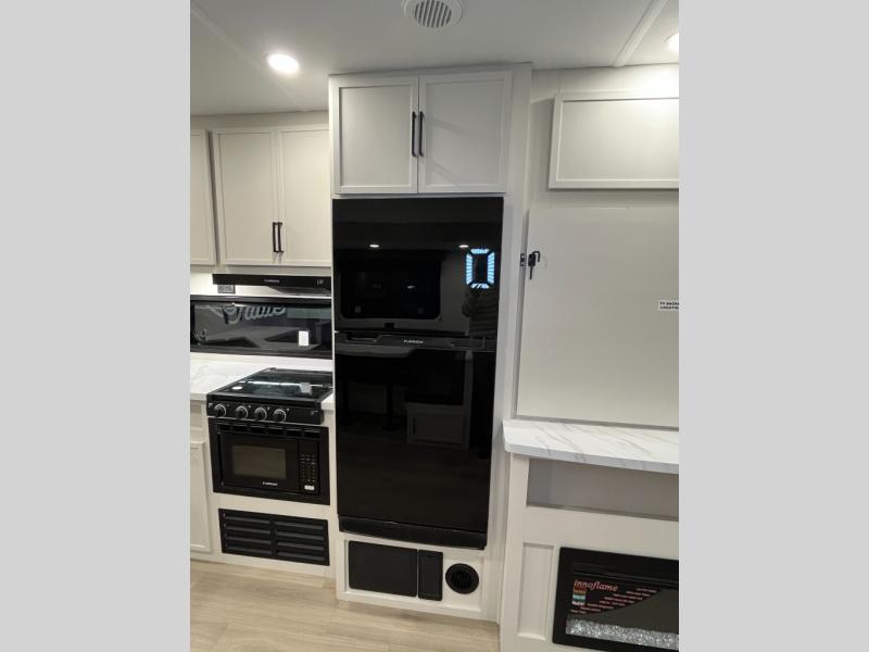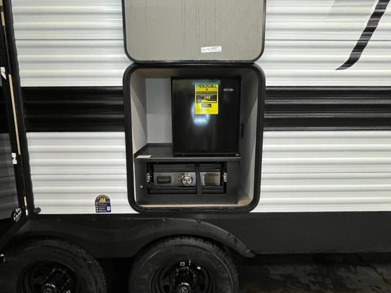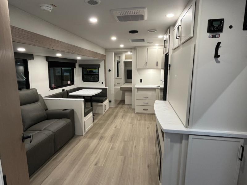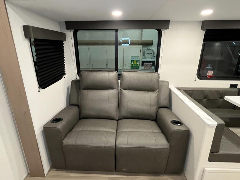 The spacious garage area is perfect for hauling your favorite toys, and the two entry/exit doors make it easy to get in and out. The front bedroom is a peaceful retreat, featuring a queen bed, wardrobes, and plenty of storage for your gear. Further in the heart of this unit, the U-shaped dinette is perfect for enjoying meals or game nights, and the pull-out trash makes cleanup a breeze. The kitchen is equipped with a microwave and 8 cu refrigerator, so you can fuel up for your next adventure. The theater seating is perfect for movie nights or catching up on your favorite shows, and the electric Happijac bunks provide a comfortable spot to rest. The full bathroom is a refreshing oasis, equipped with everything you need to start your day feeling revitalized.